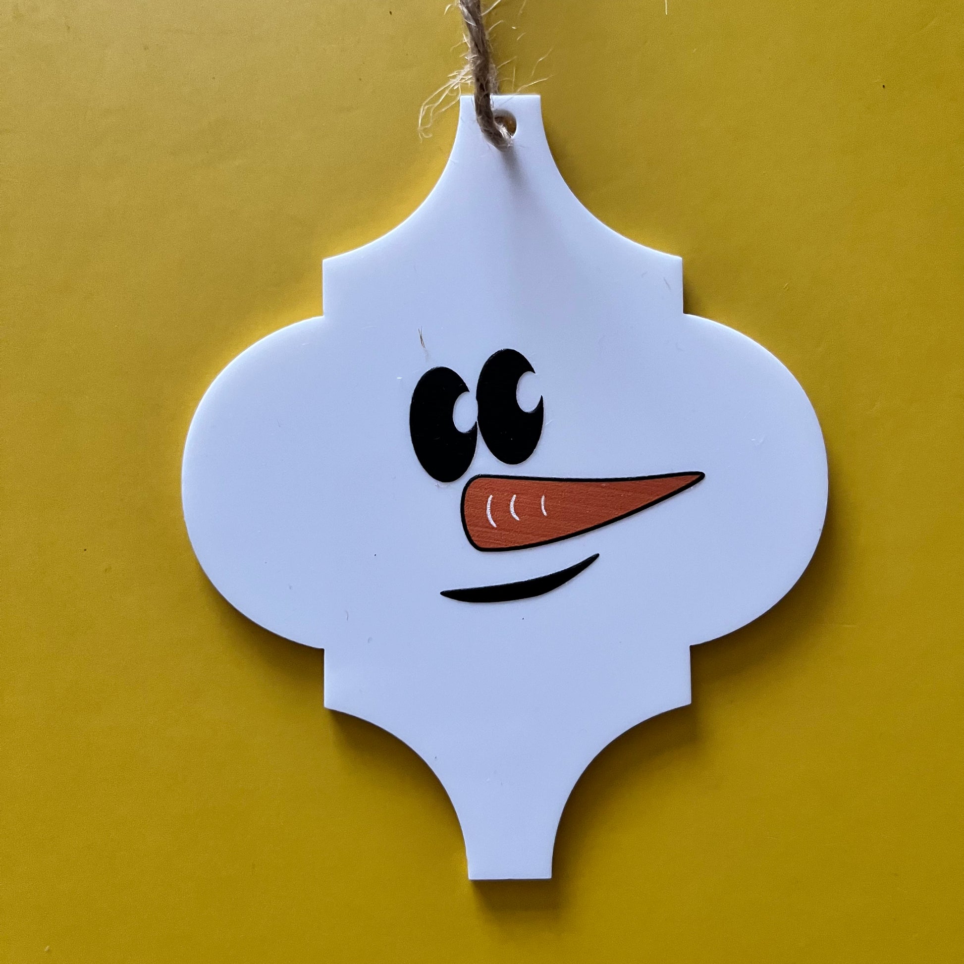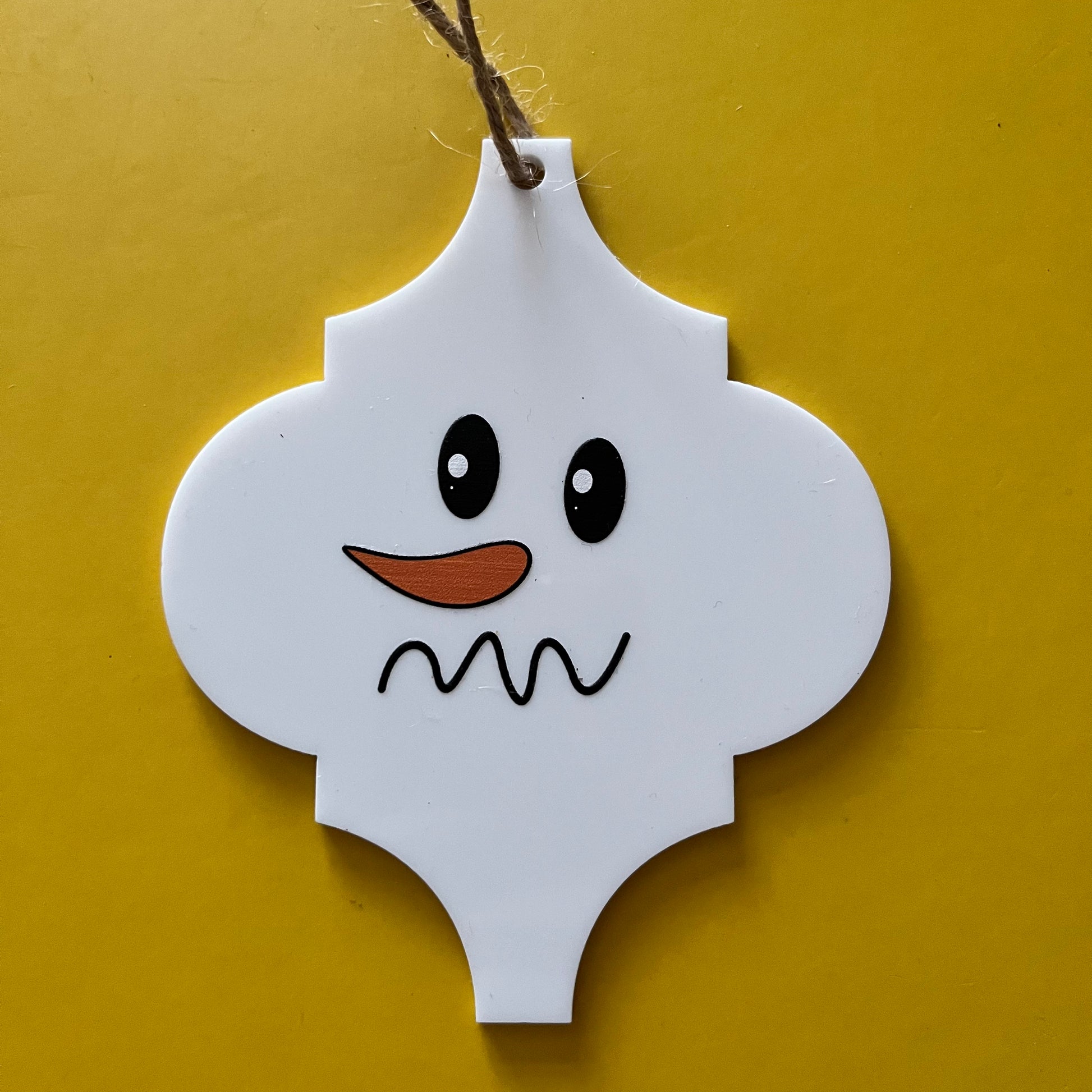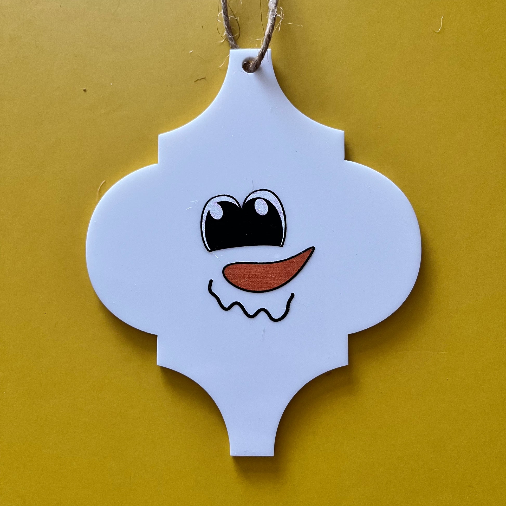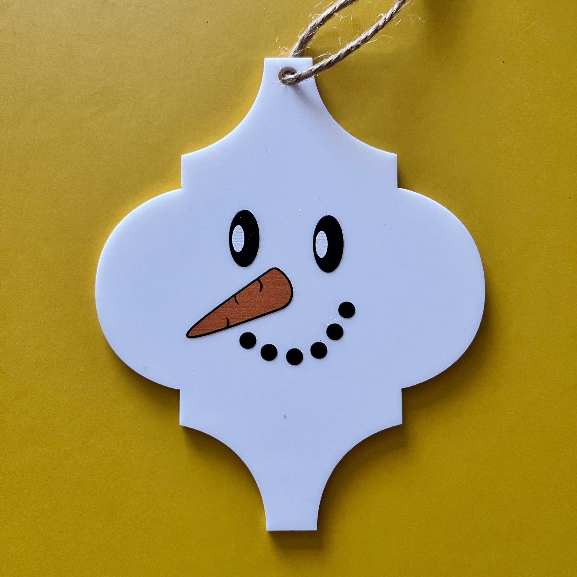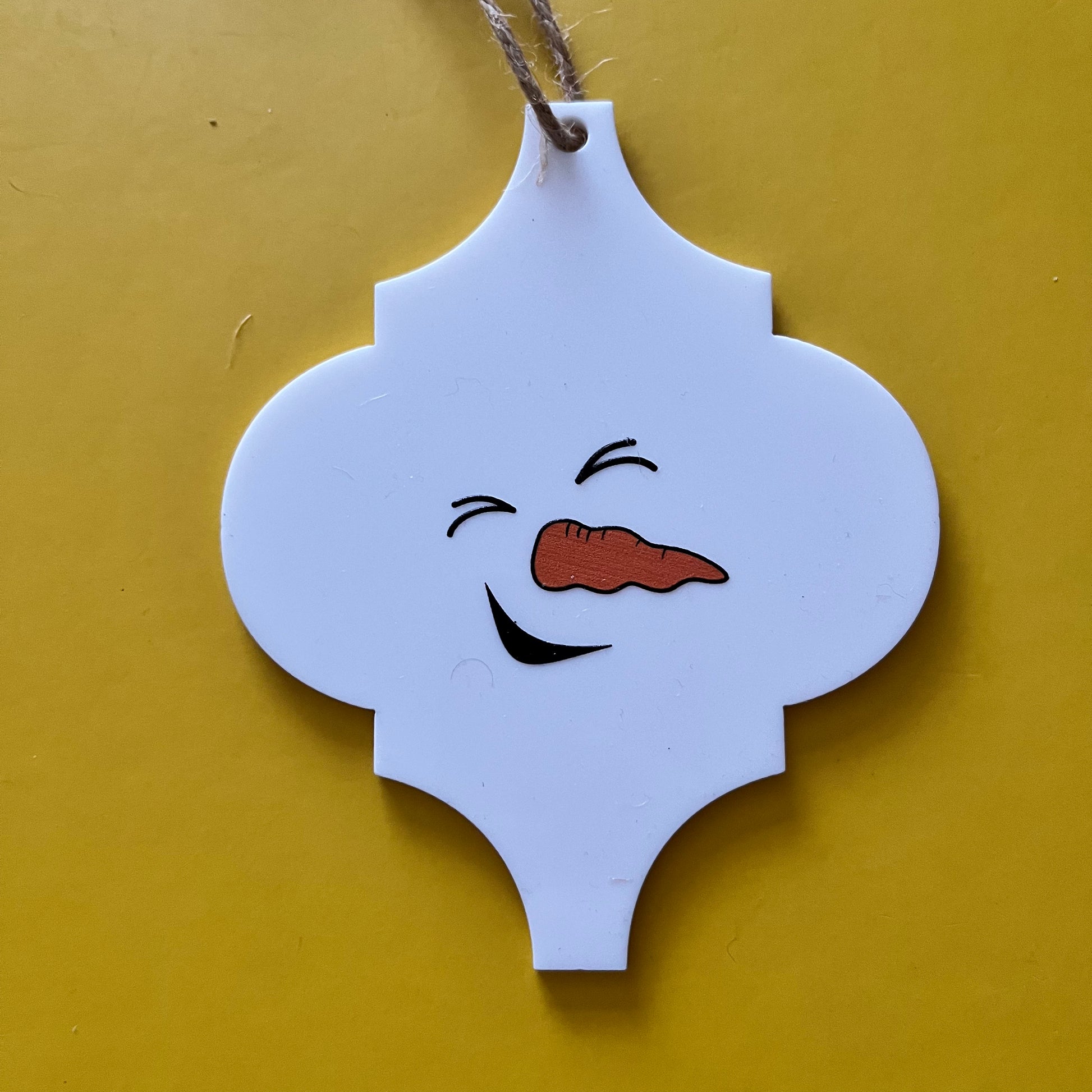 These acrylic Arabesque shaped tree decorations feature a series of Snowman/Snowlady faces . They measure approx 100x125x2mm.