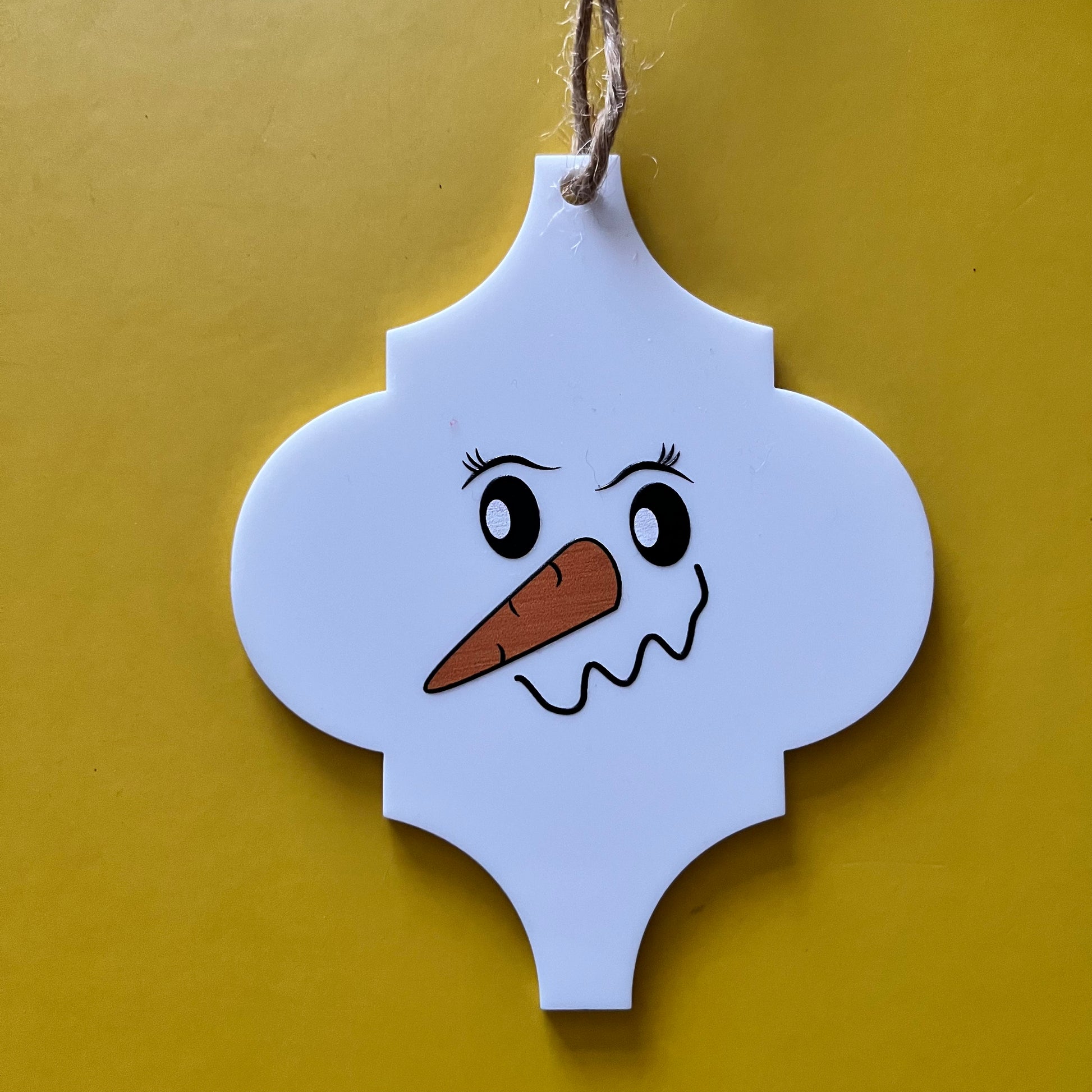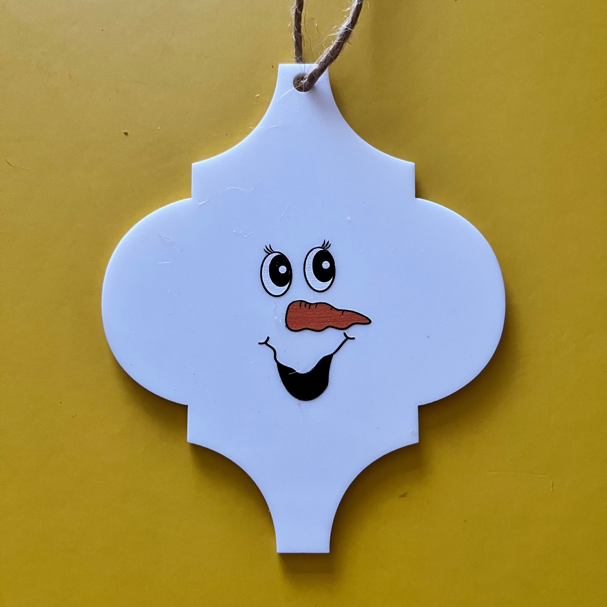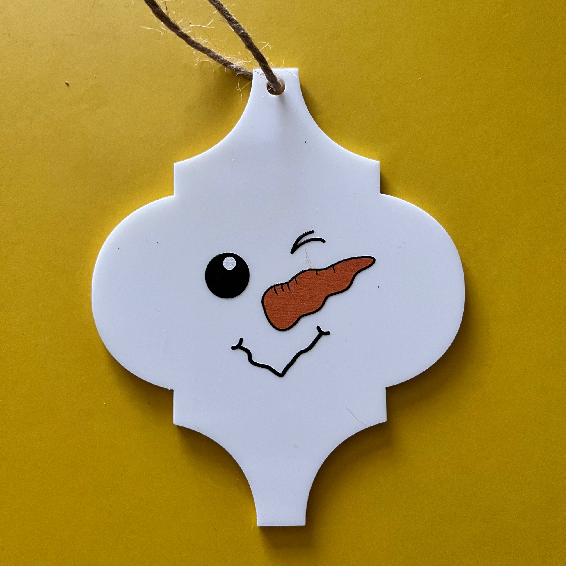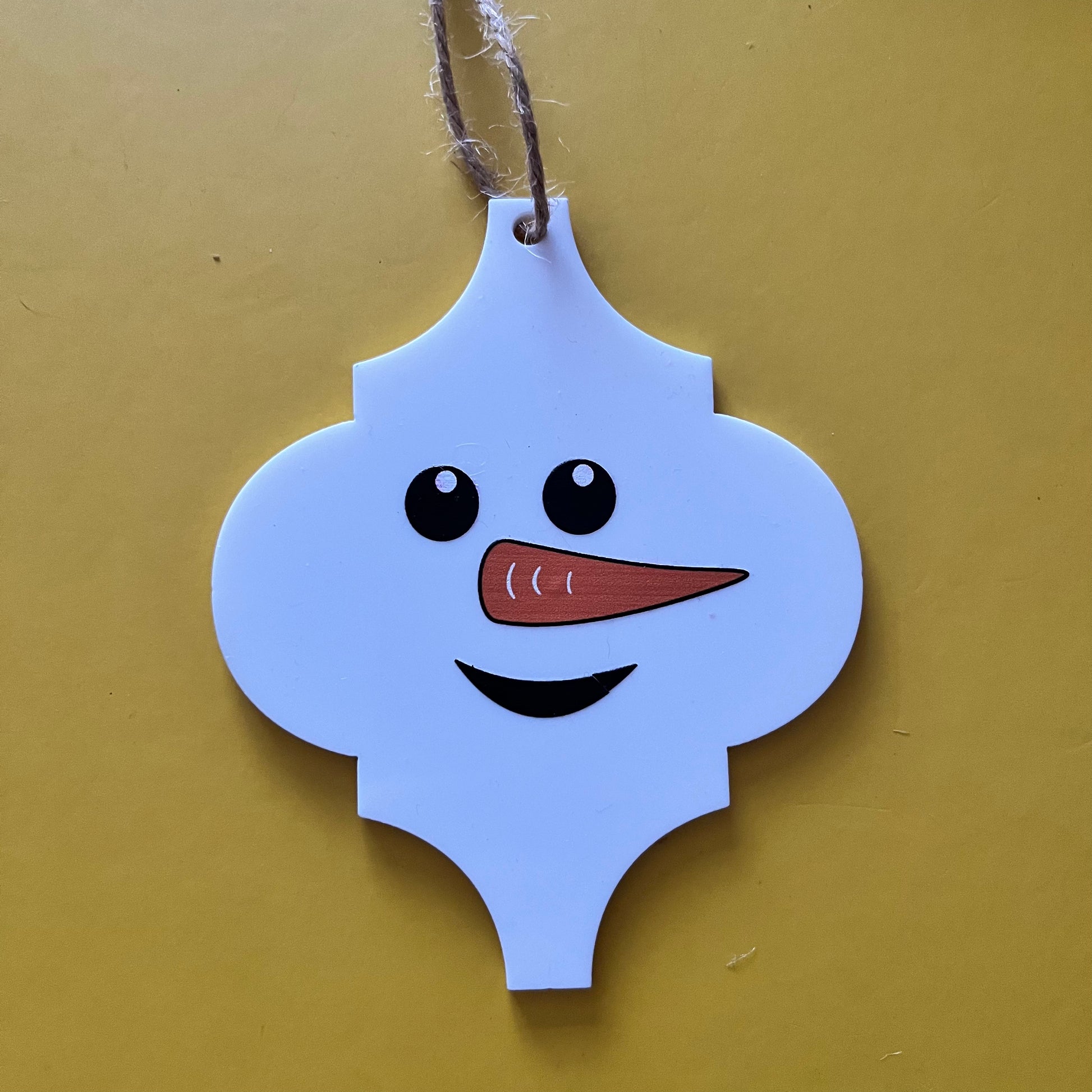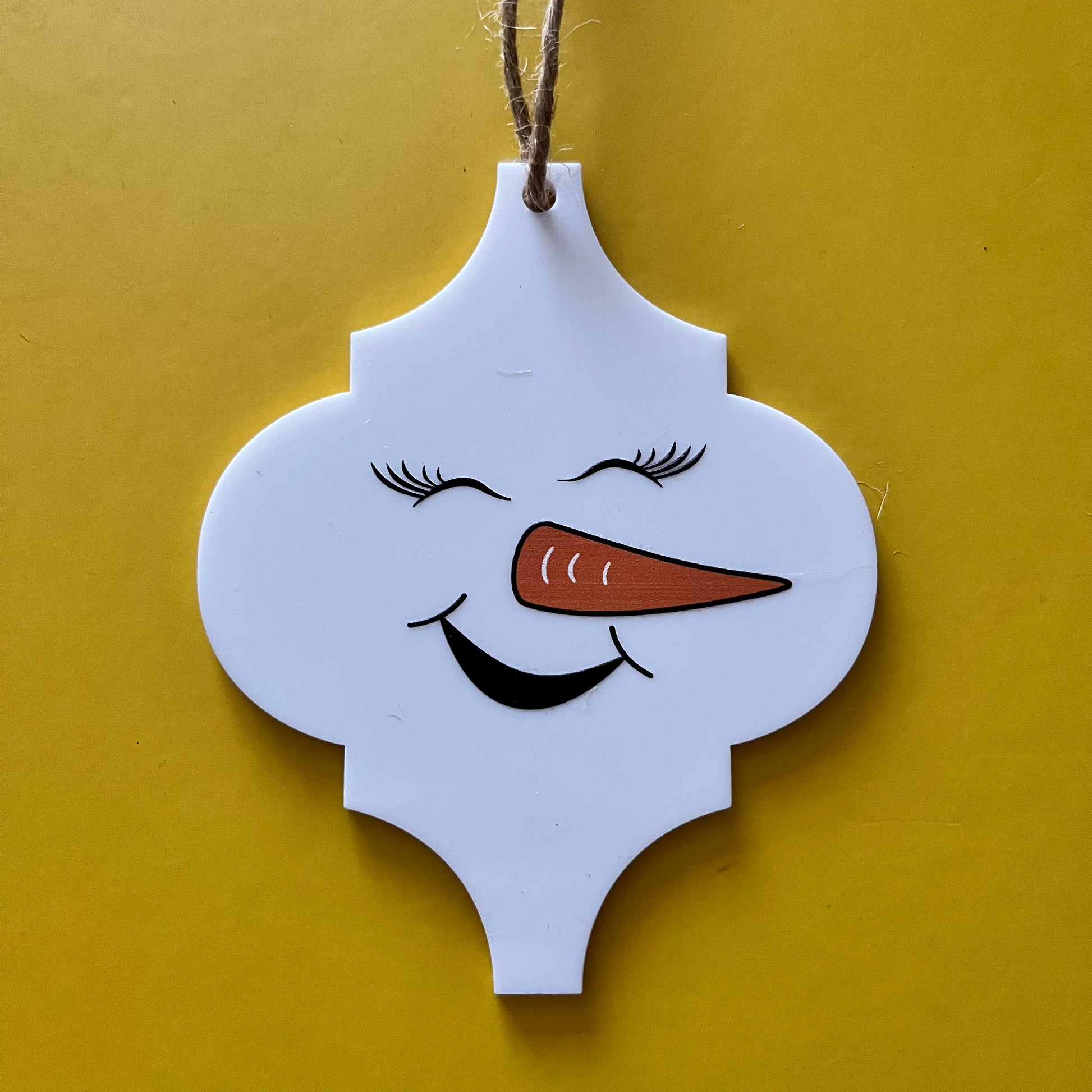 These acrylic Arabesque shaped tree decorations feature a series of Snowman/Snowlady faces . They measure approx 100x125x2mm.