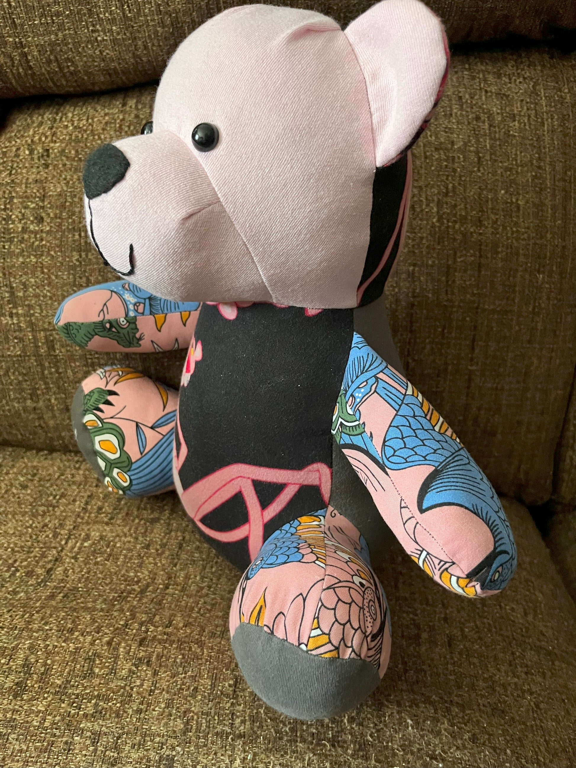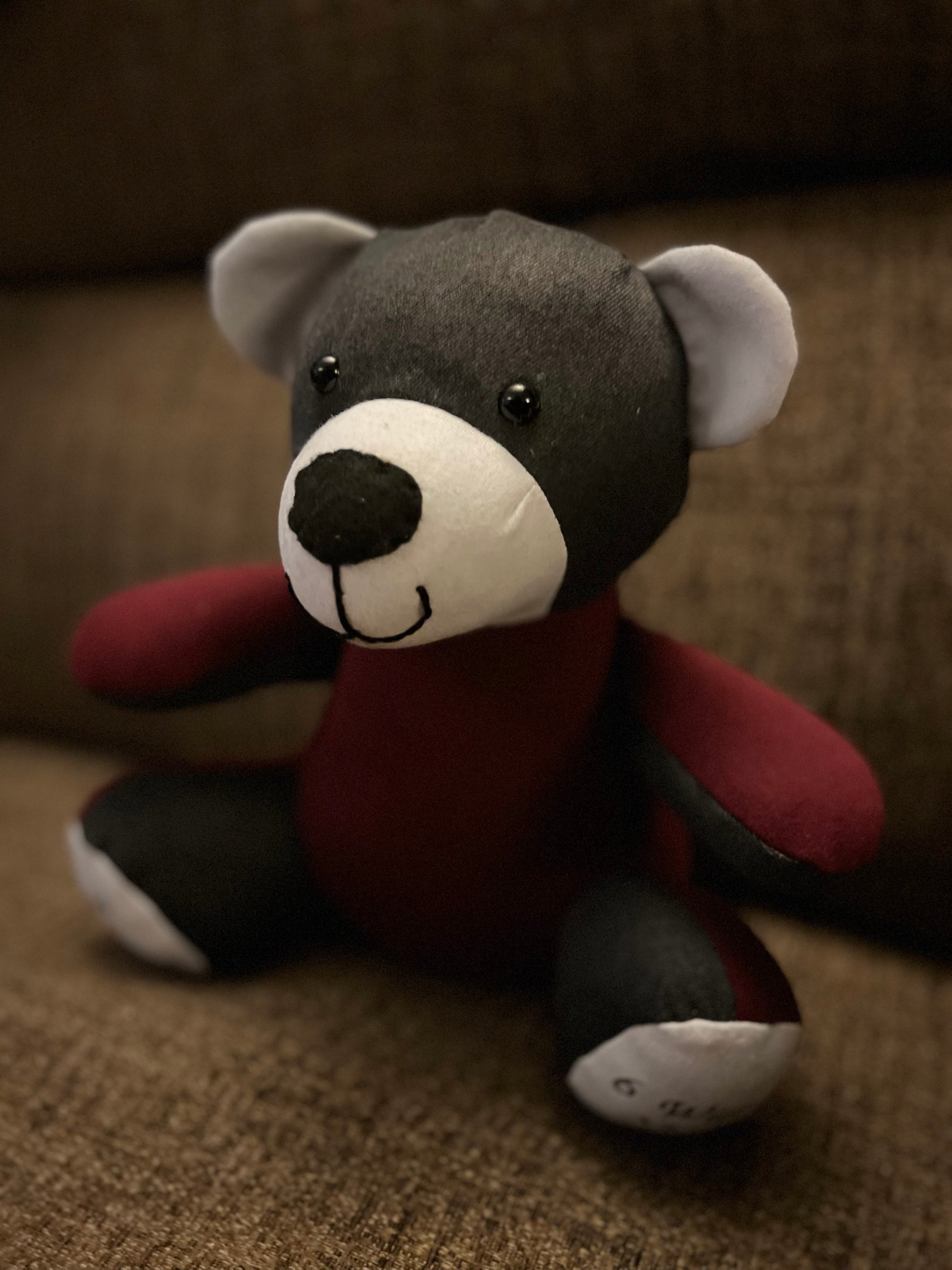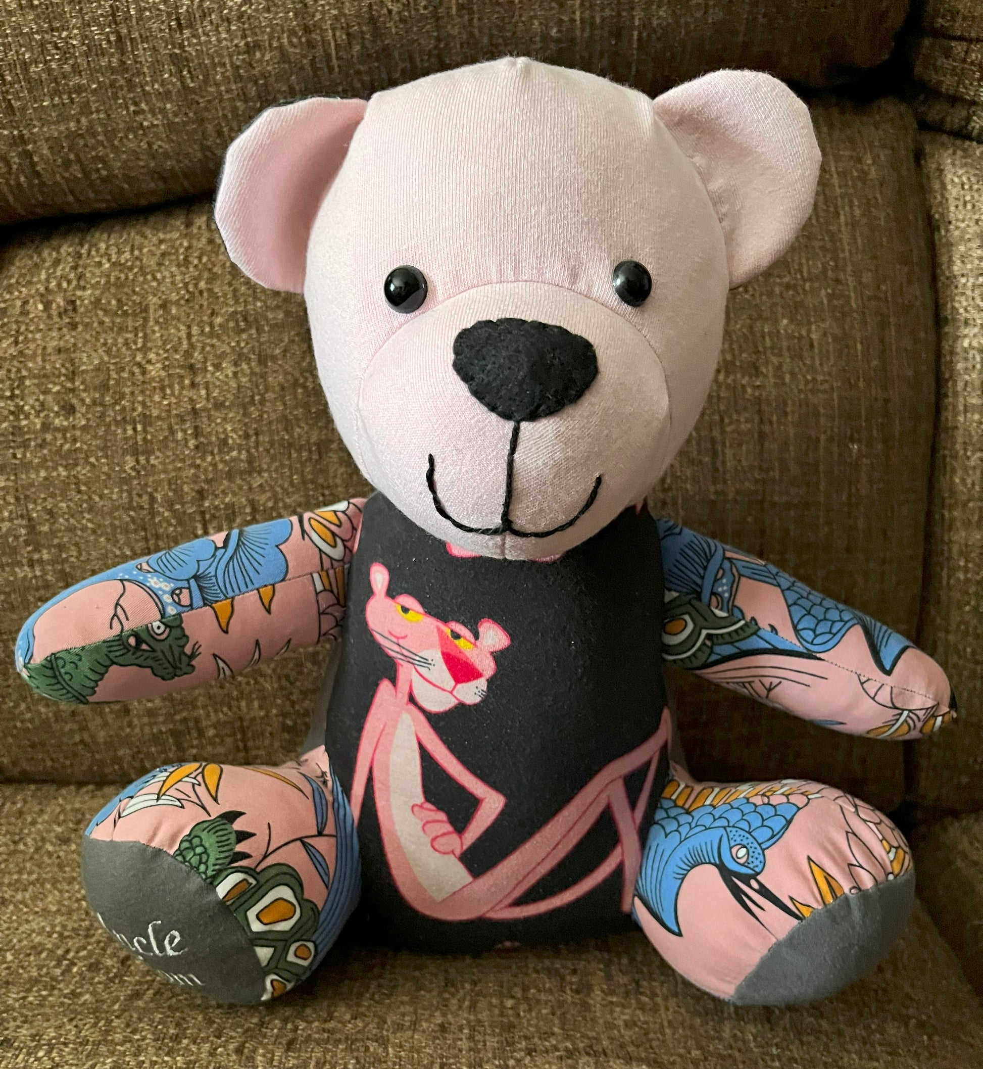 Our Ben Memory Bear is an ideal design for items of clothing which have a large picture or other design - the photo shows one I made using two 'picture' shirts and two plain T-Shirts. Embroidered personalisation can be added to the front tummy panel to make your bear truly unique and if you want a School Leaver bear, then a school badge can be added to the back. Ben is a seated bear and measures approx 30cm/11inch in the large size and approx 25.5cm/10inch in the small size.