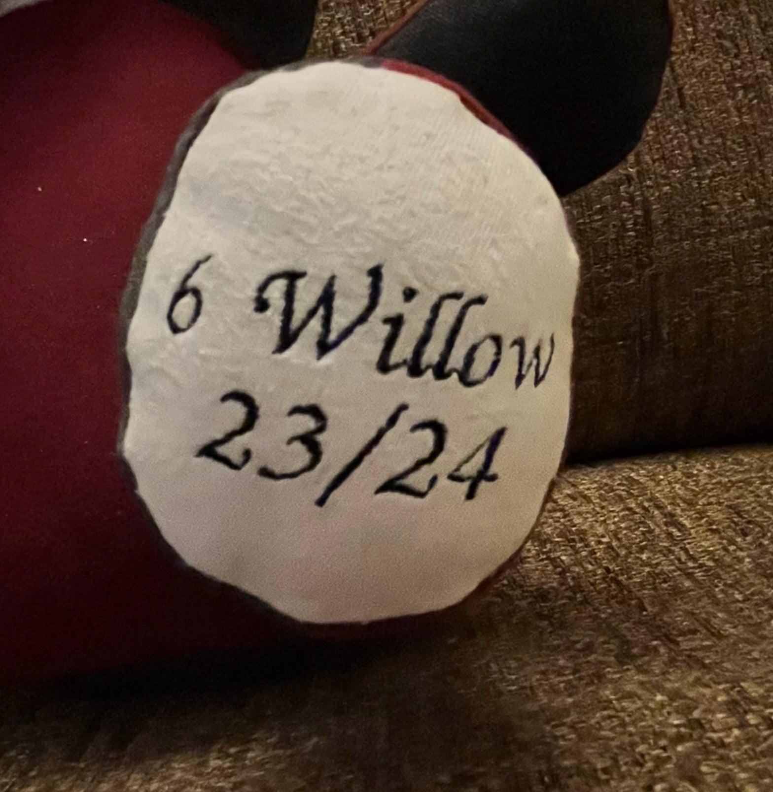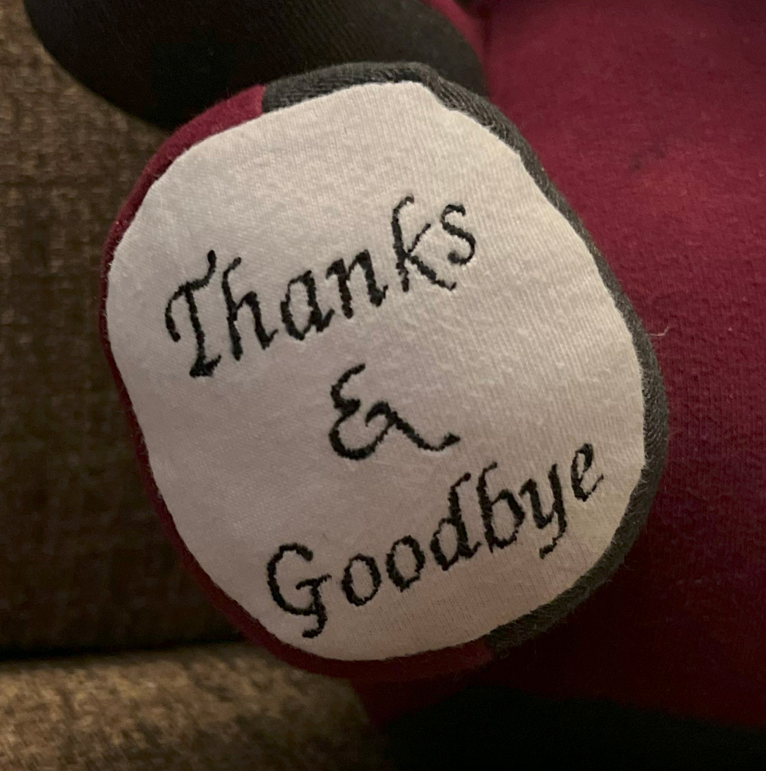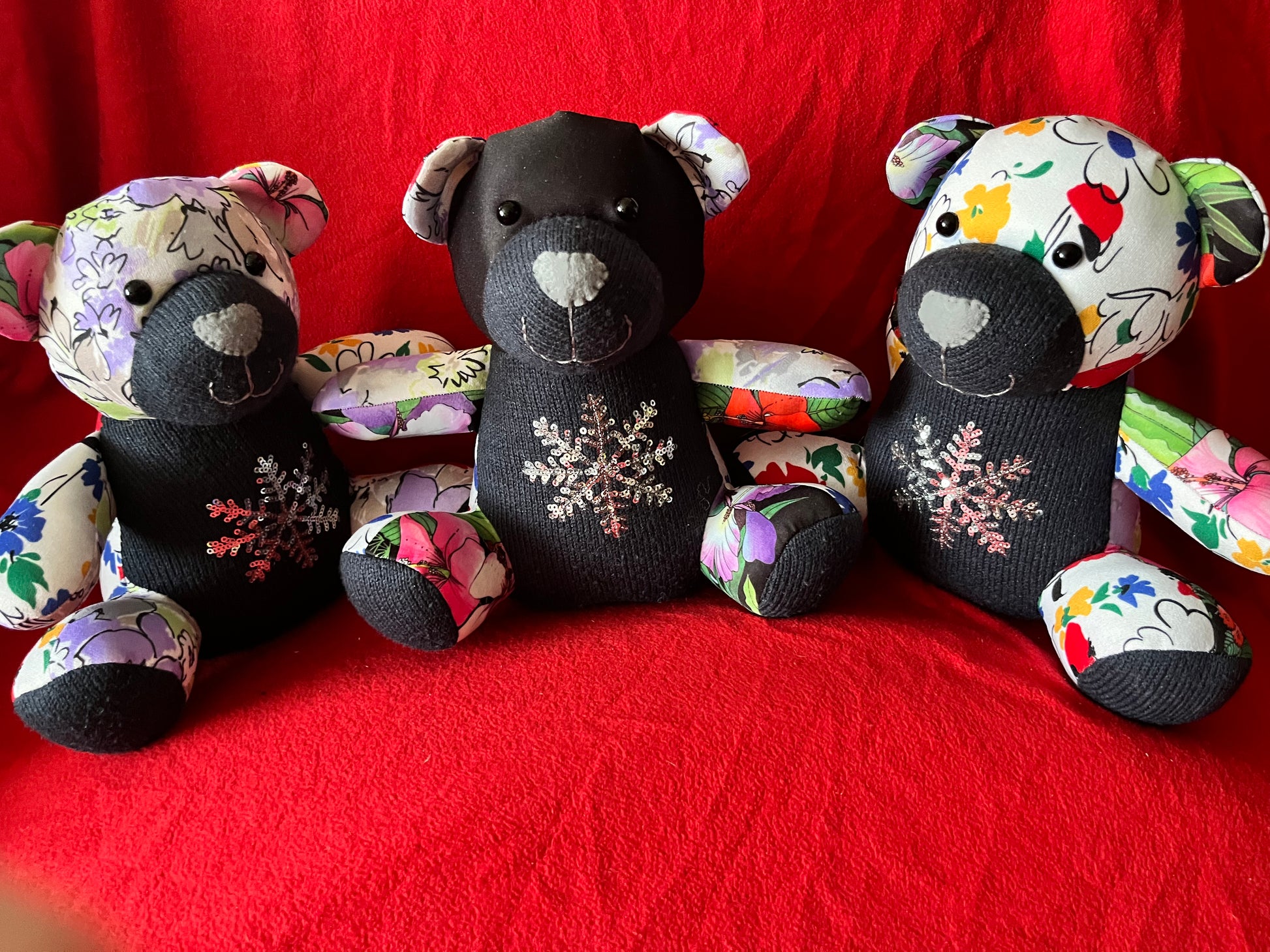 Our Ben Memory Bear is an ideal design for items of clothing which have a large picture or other design - the photo shows one I made using two 'picture' shirts and two plain T-Shirts. Embroidered personalisation can be added to the front tummy panel to make your bear truly unique and if you want a School Leaver bear, then a school badge can be added to the back. Ben is a seated bear and measures approx 30cm/11inch in the large size and approx 25.5cm/10inch in the small size.