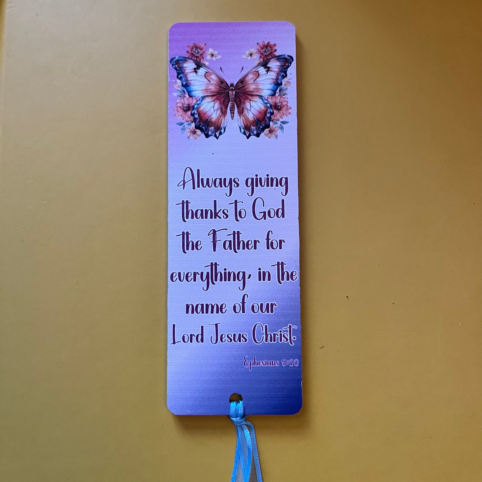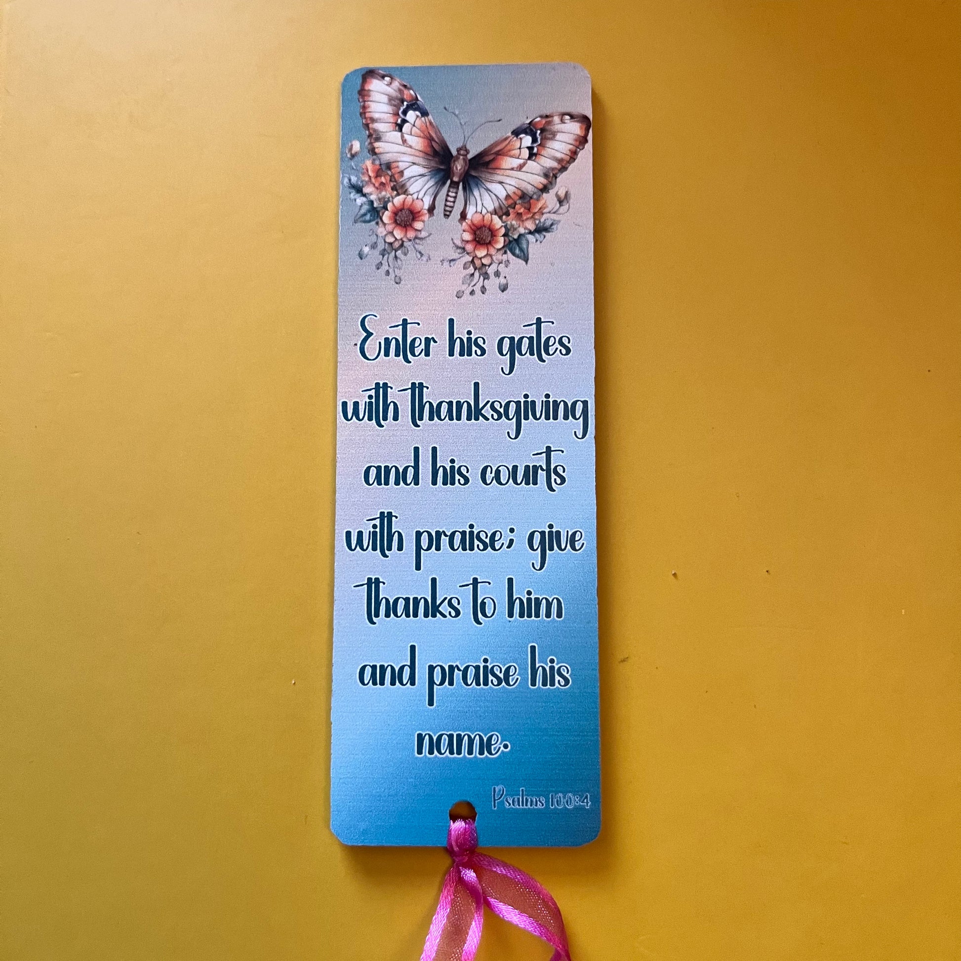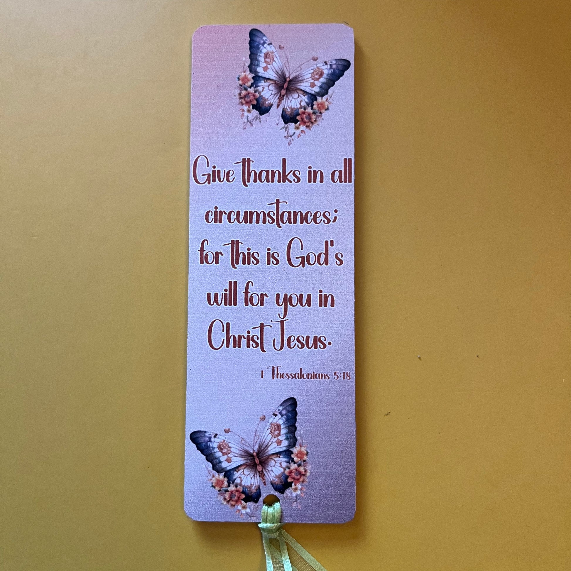 An acrylic bookmark measuring 80x65x2mm featuring a scripture based around Gratitude. Each bookmark has a tassel tied through a central hole.
