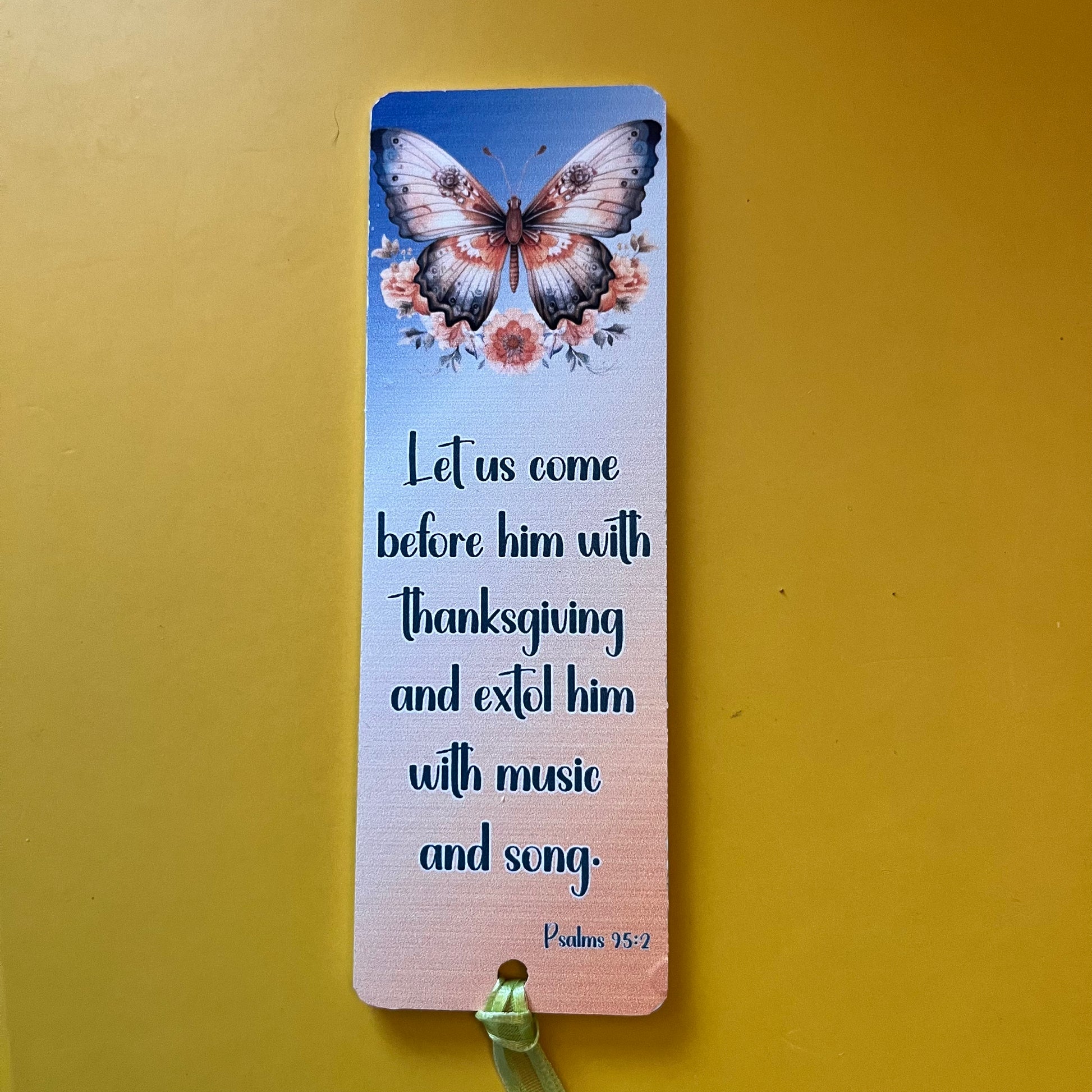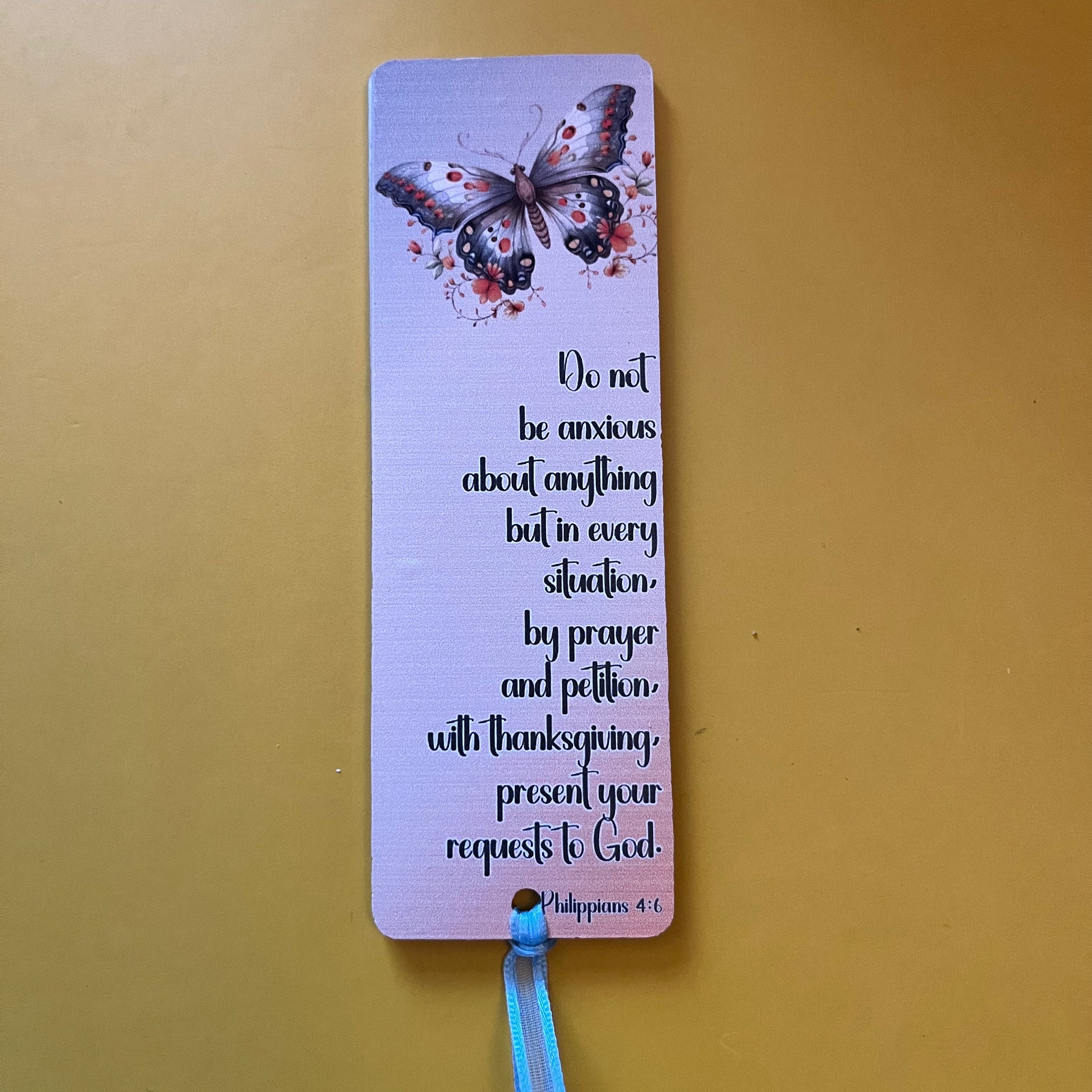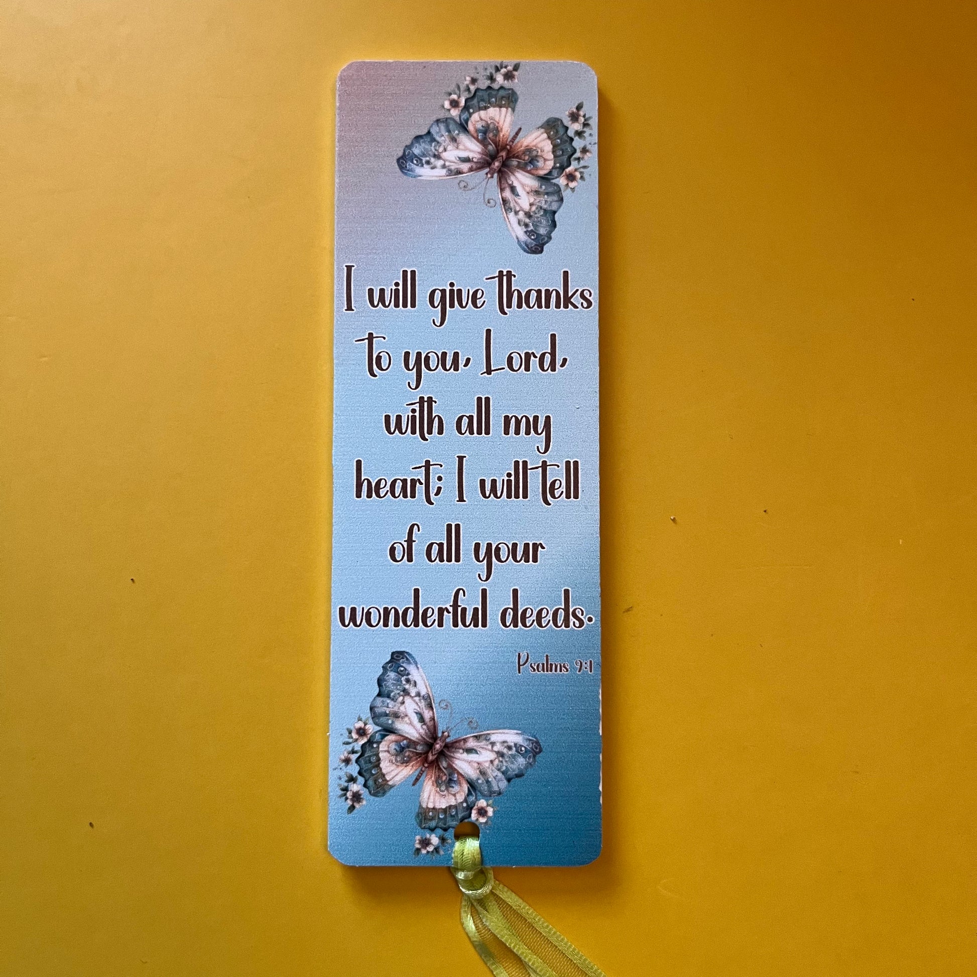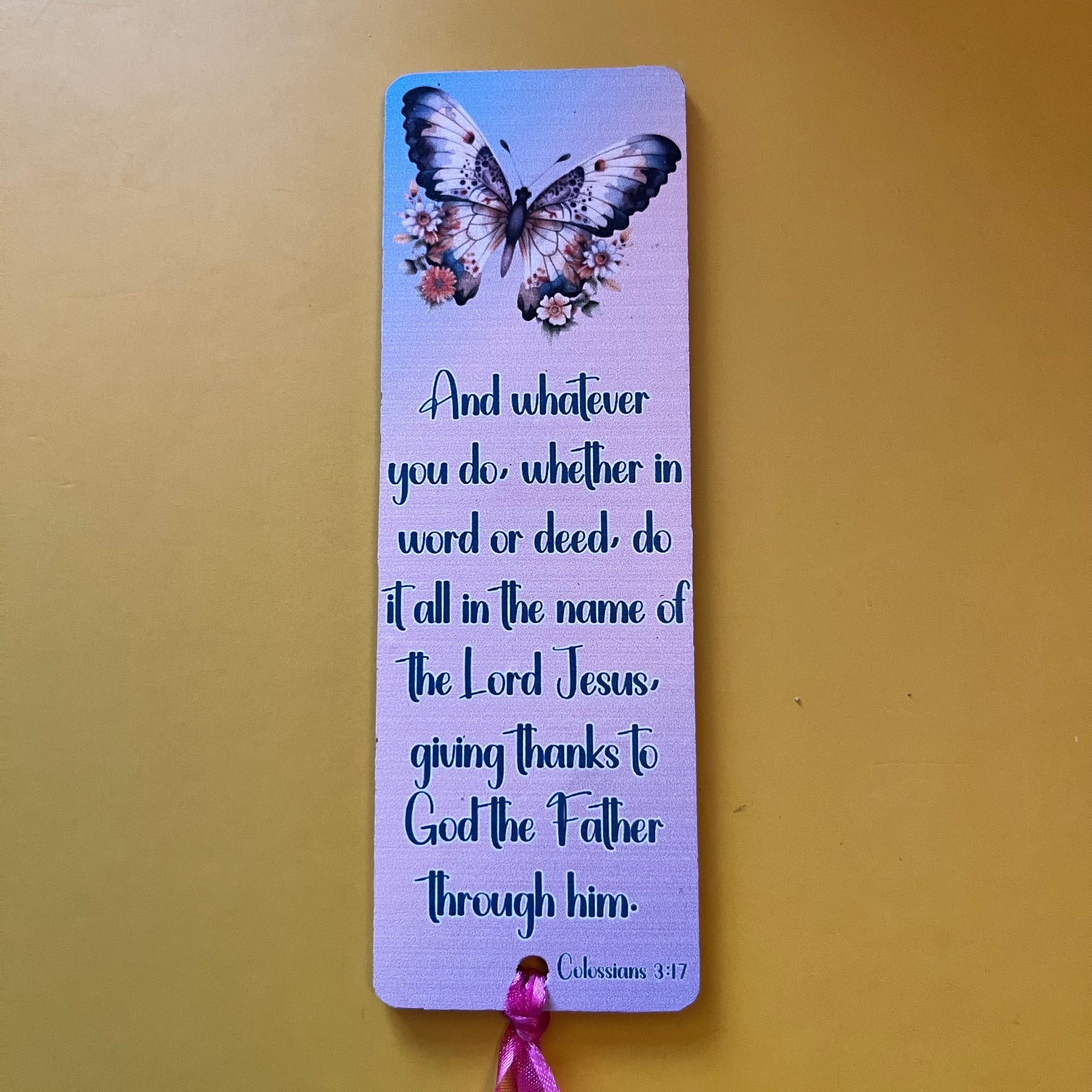 An acrylic bookmark measuring 80x65x2mm featuring a scripture based around Gratitude. Each bookmark has a tassel tied through a central hole.