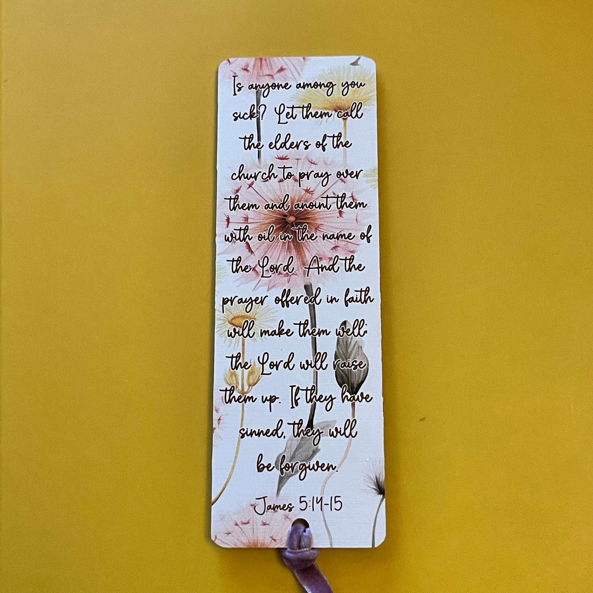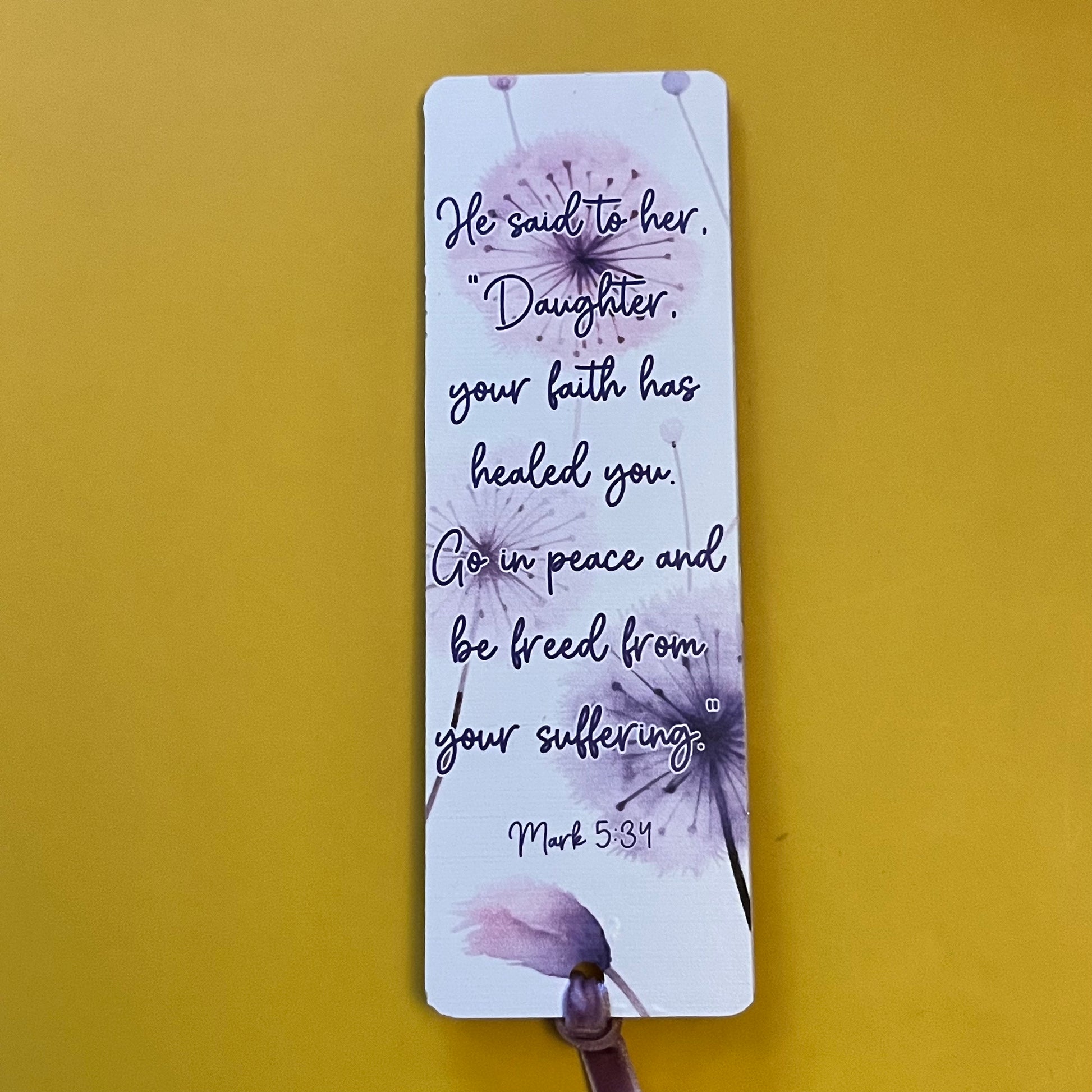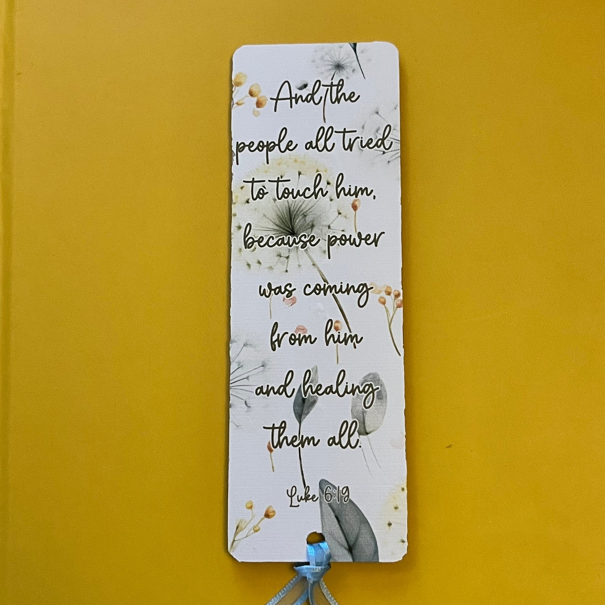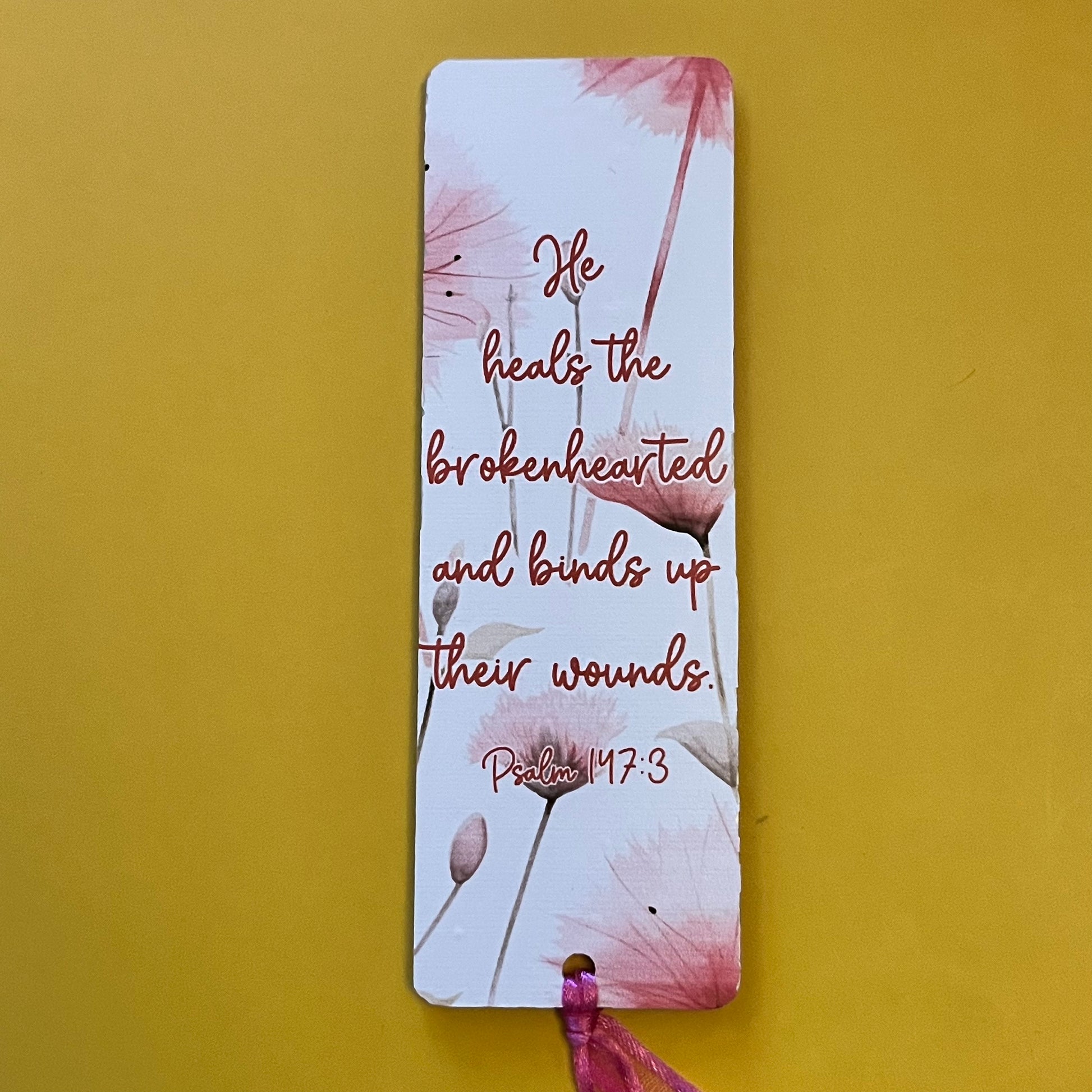 An acrylic bookmark measuring 80x65x2mm featuring a scripture based around Healing. Each bookmark has a tassel tied through a central hole.