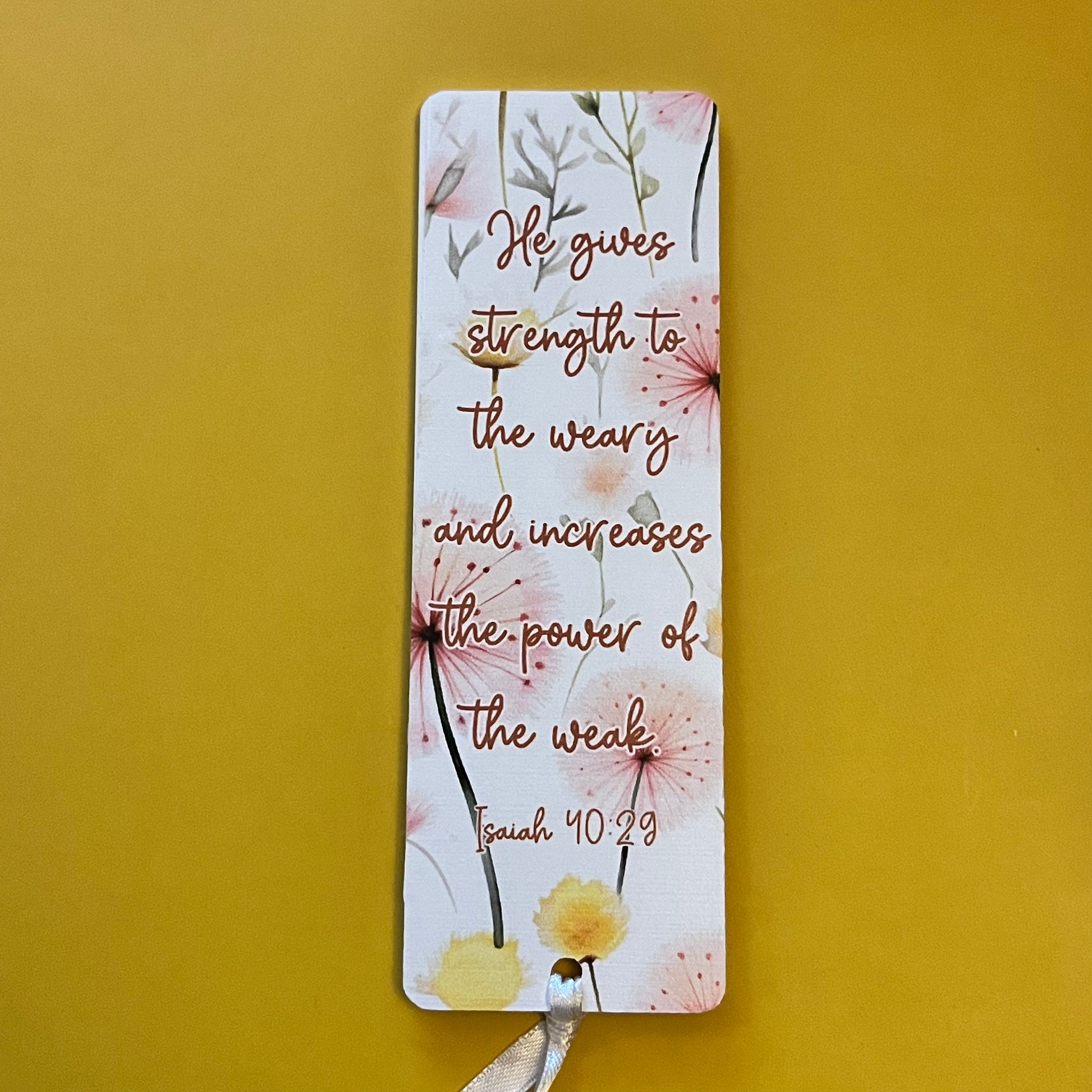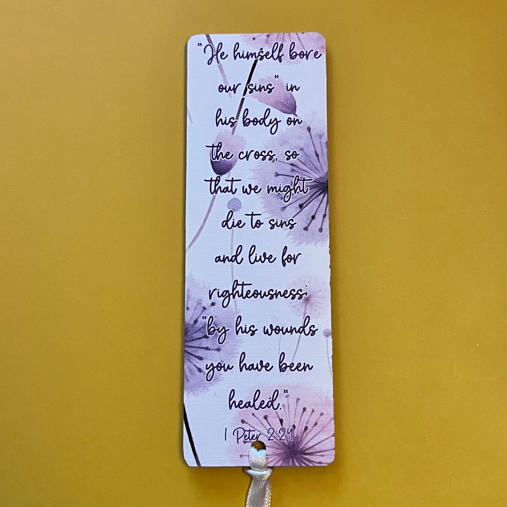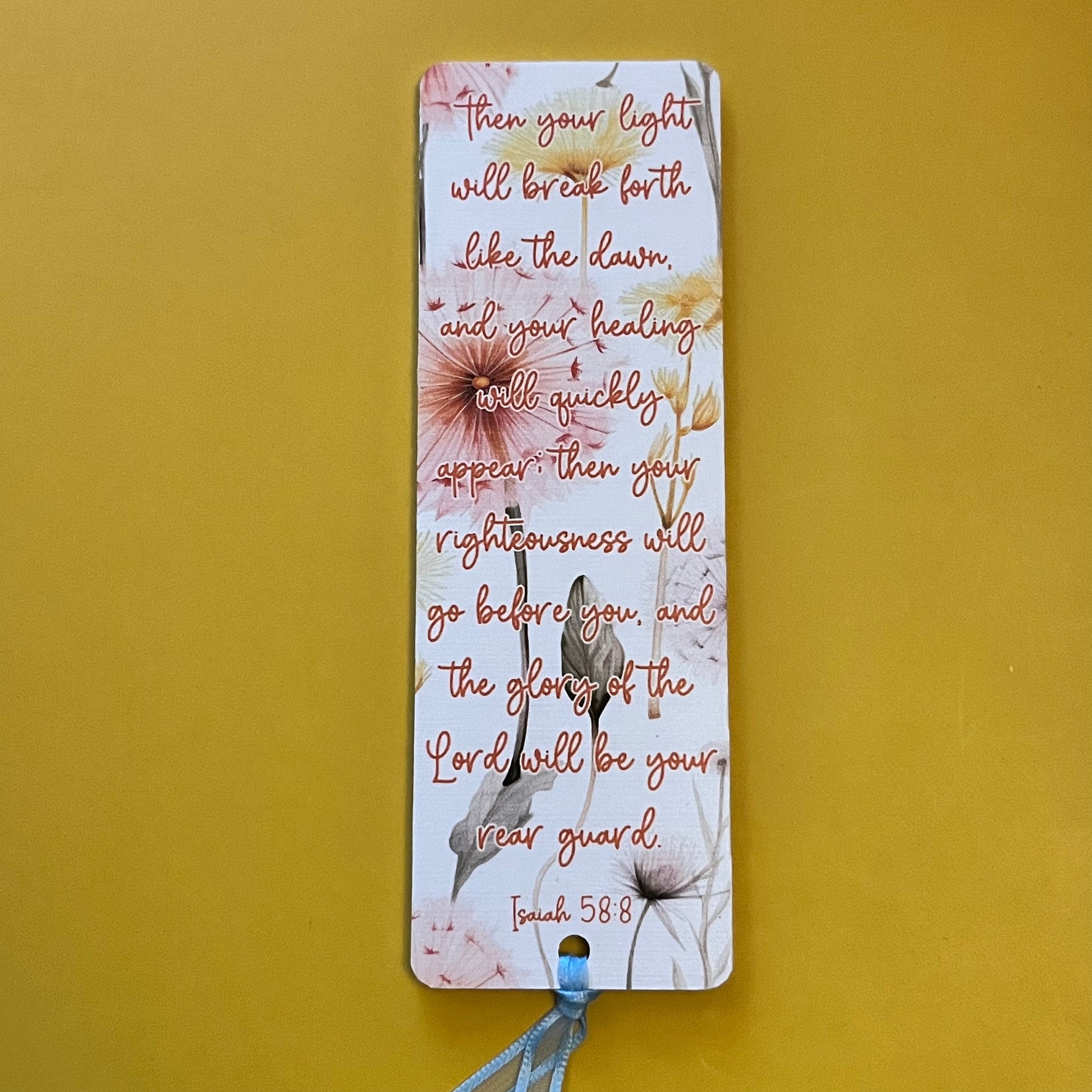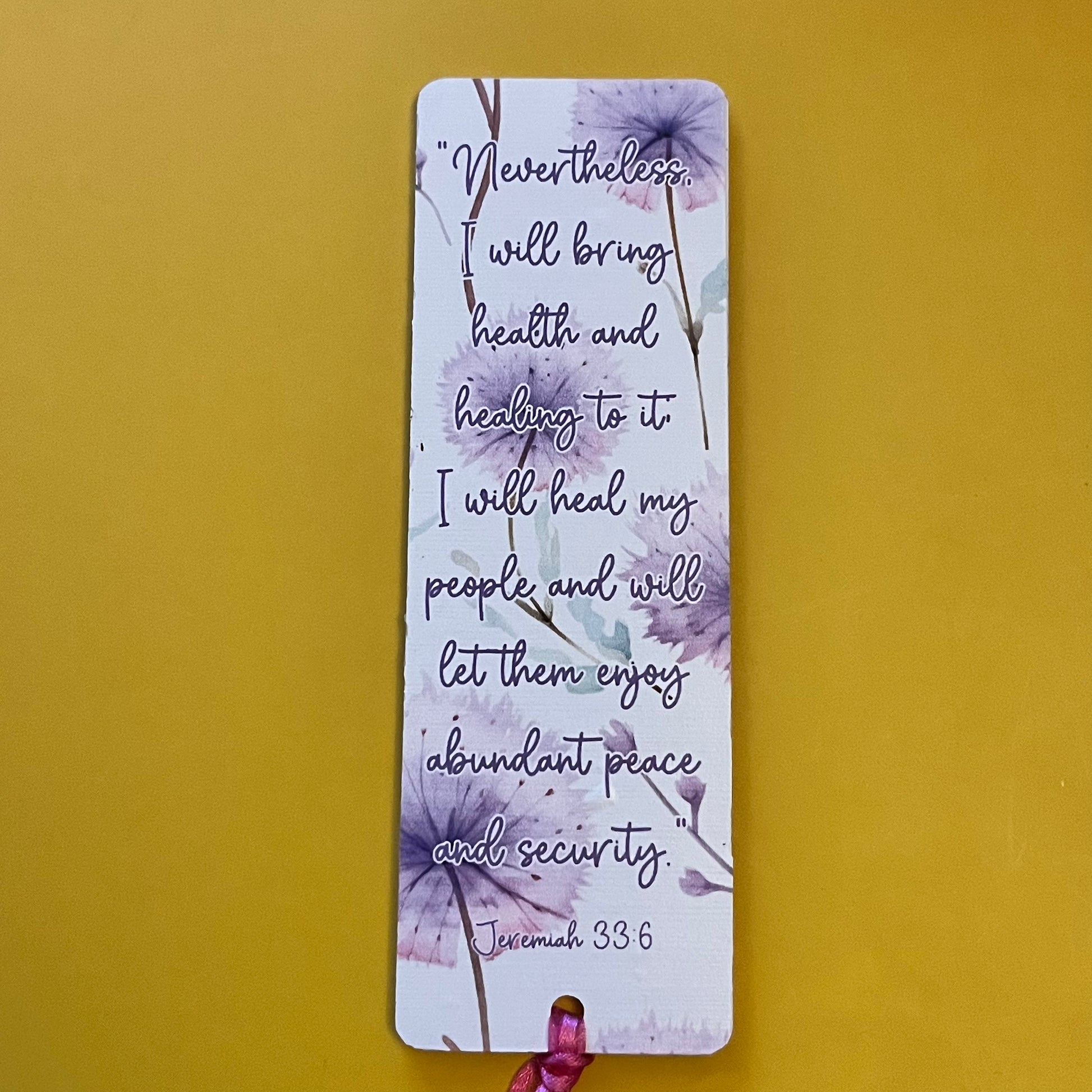 An acrylic bookmark measuring 80x65x2mm featuring a scripture based around Healing. Each bookmark has a tassel tied through a central hole.