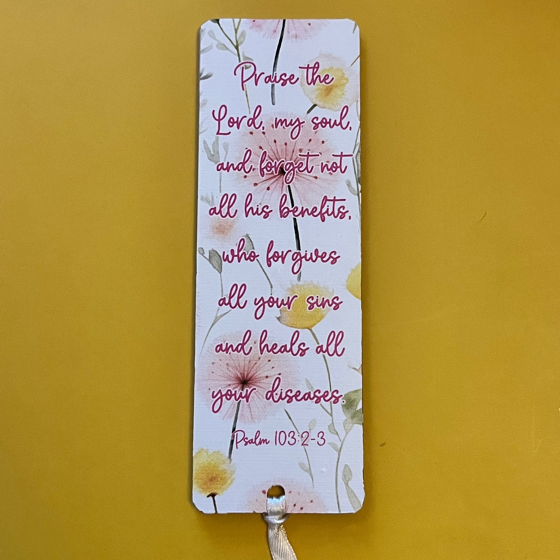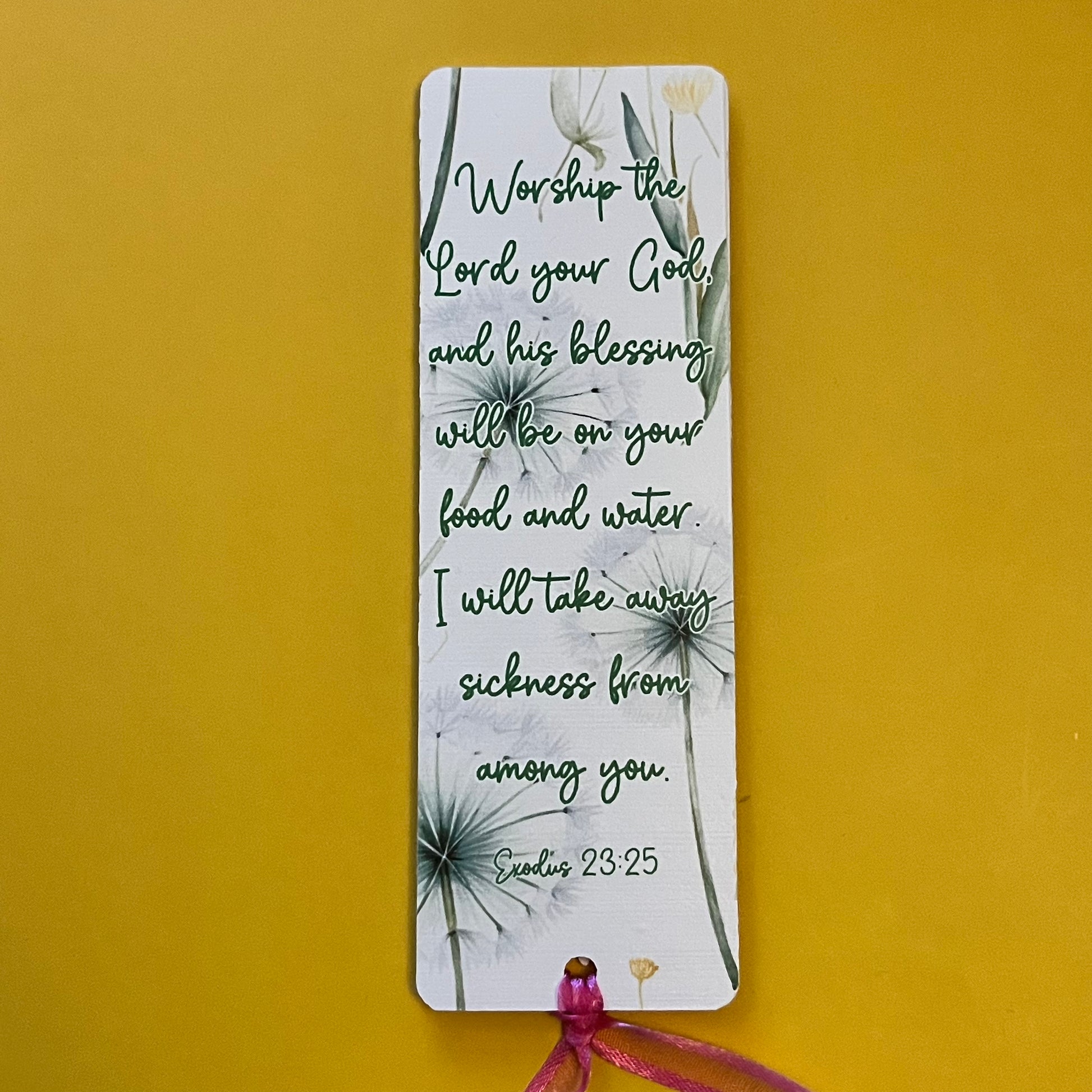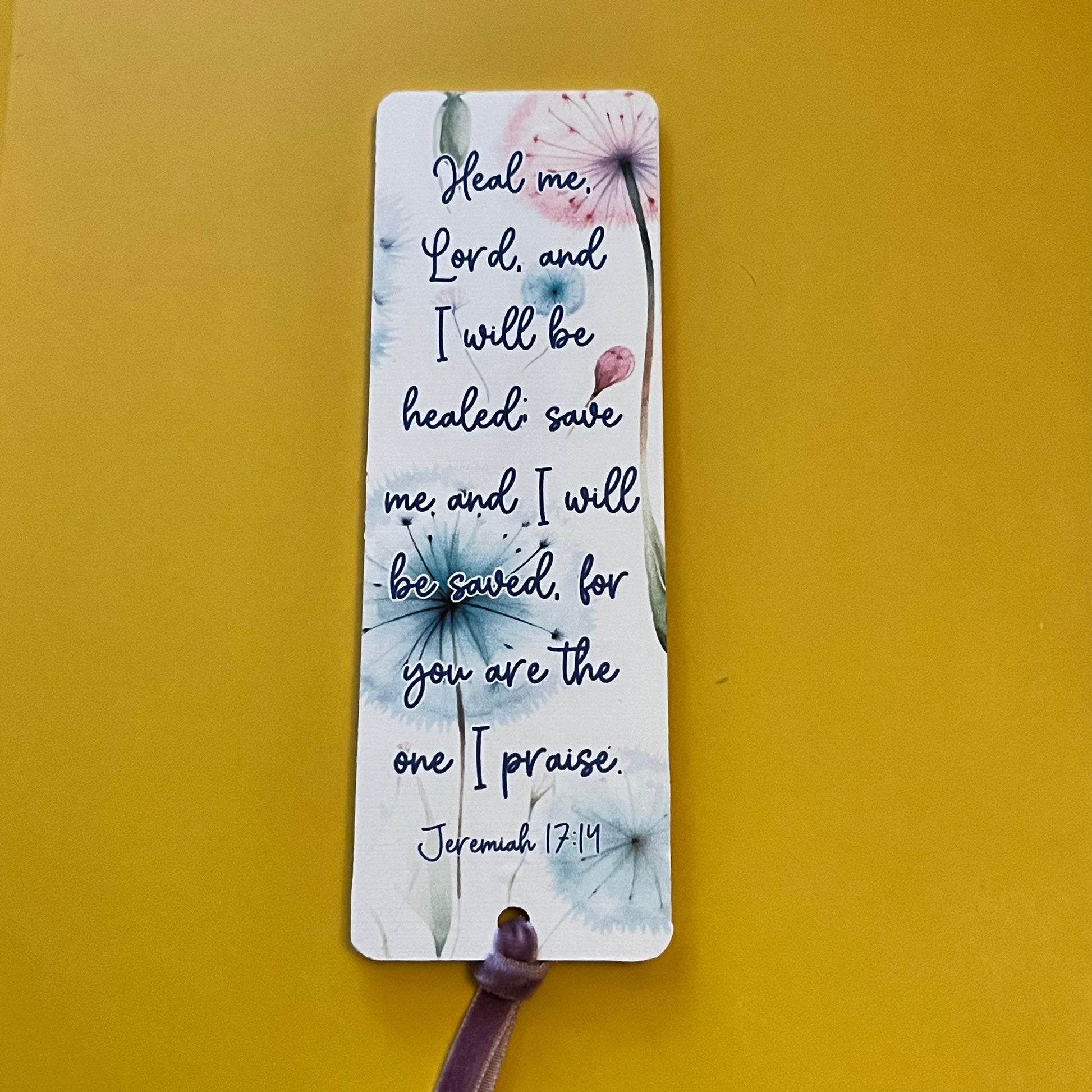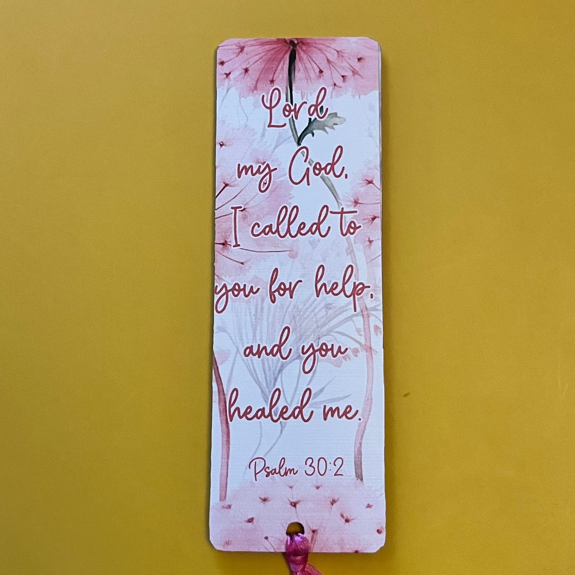 An acrylic bookmark measuring 80x65x2mm featuring a scripture based around Healing. Each bookmark has a tassel tied through a central hole.