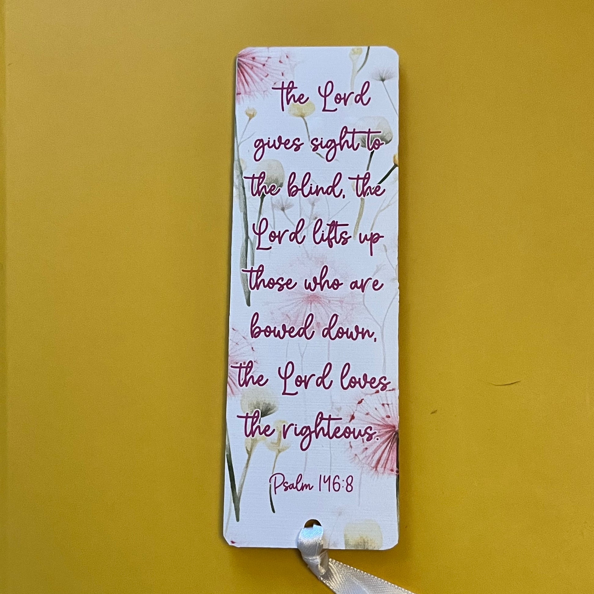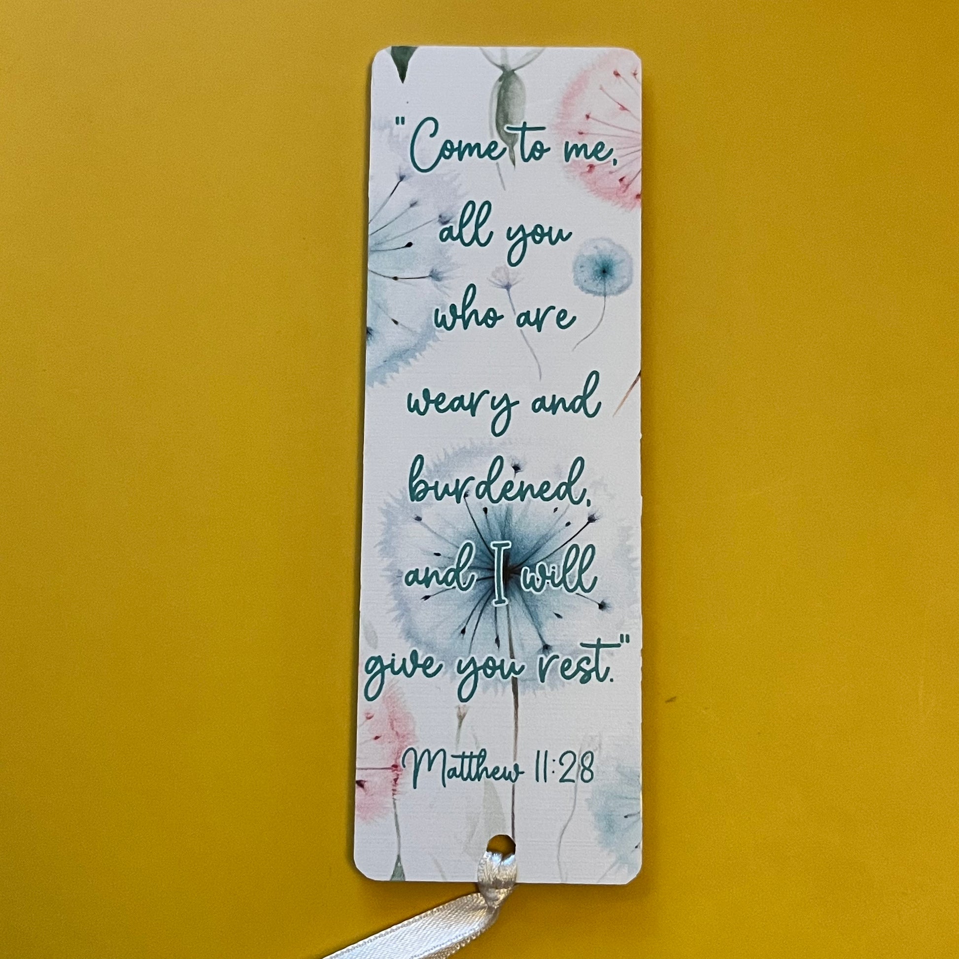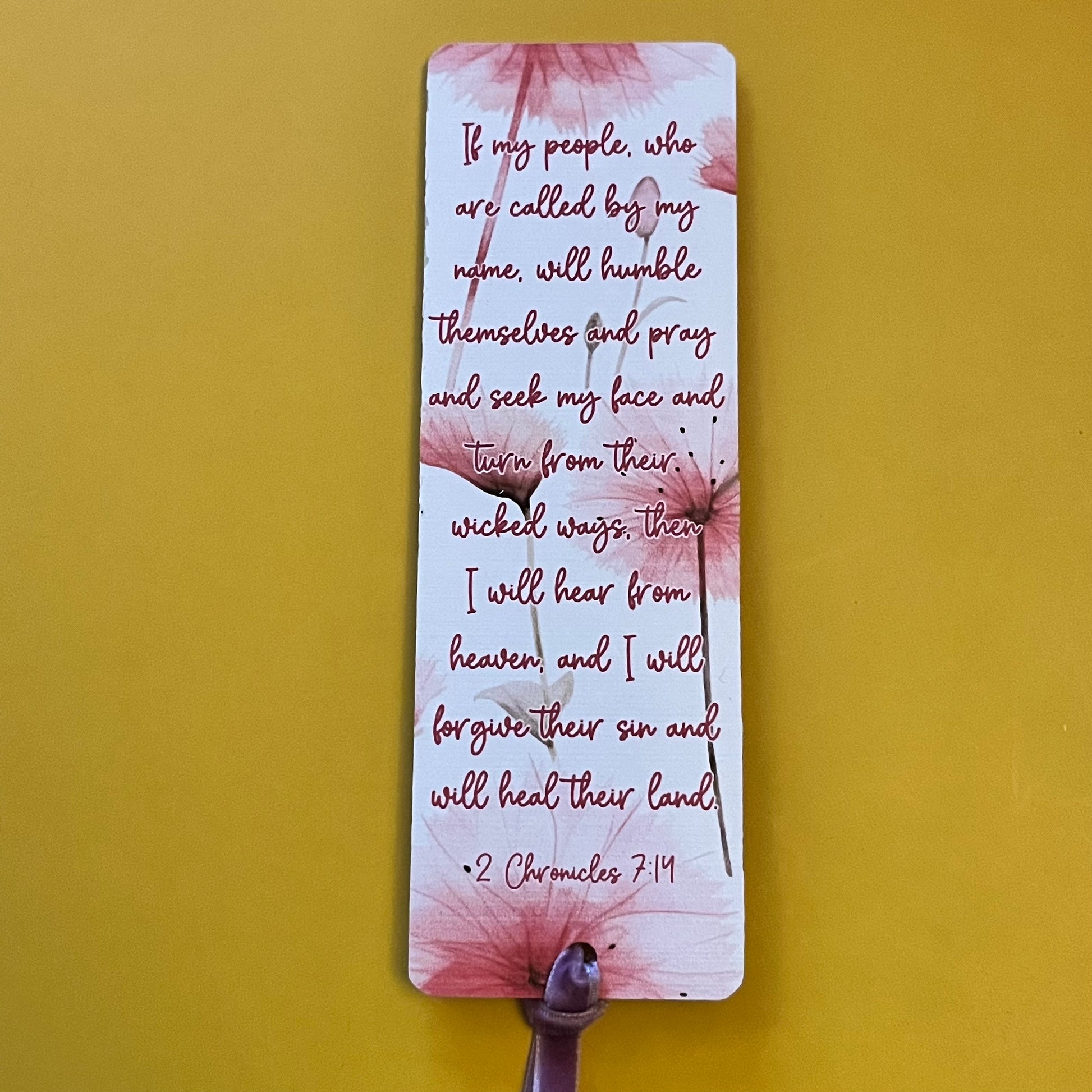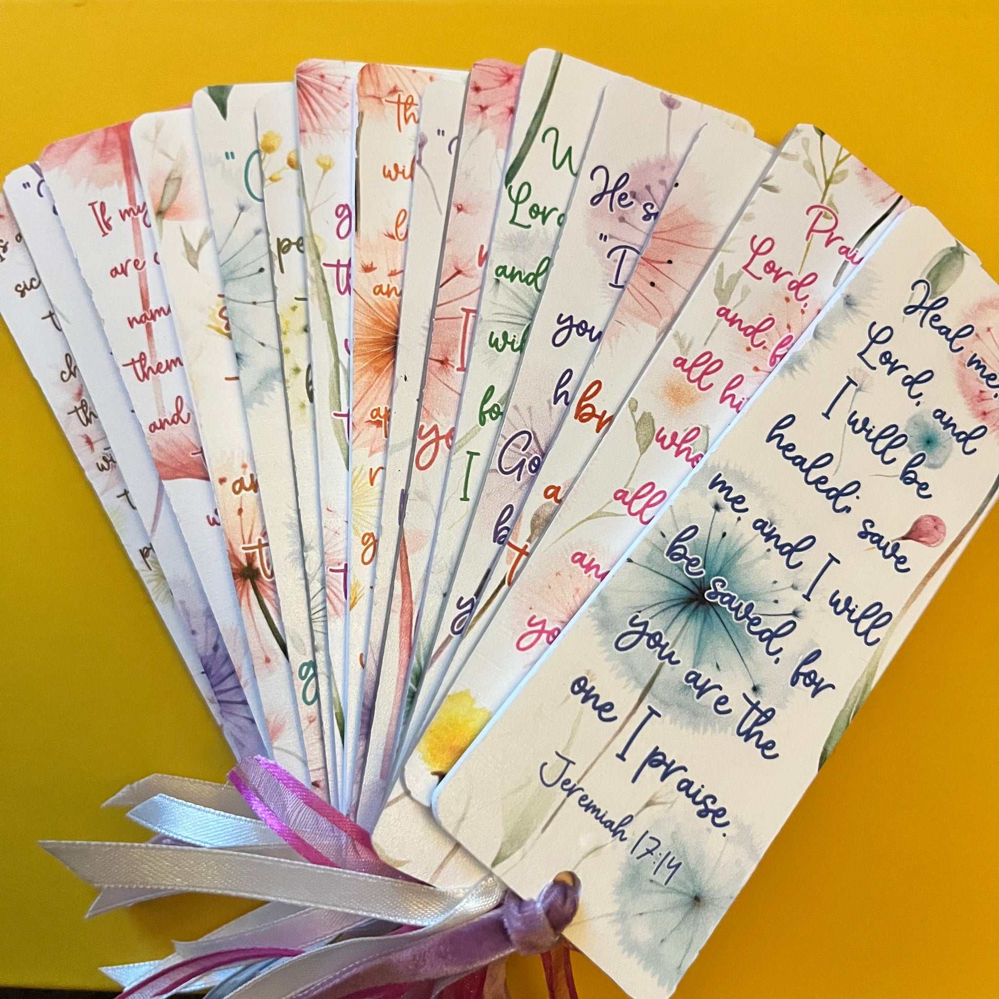 An acrylic bookmark measuring 80x65x2mm featuring a scripture based around Healing. Each bookmark has a tassel tied through a central hole.