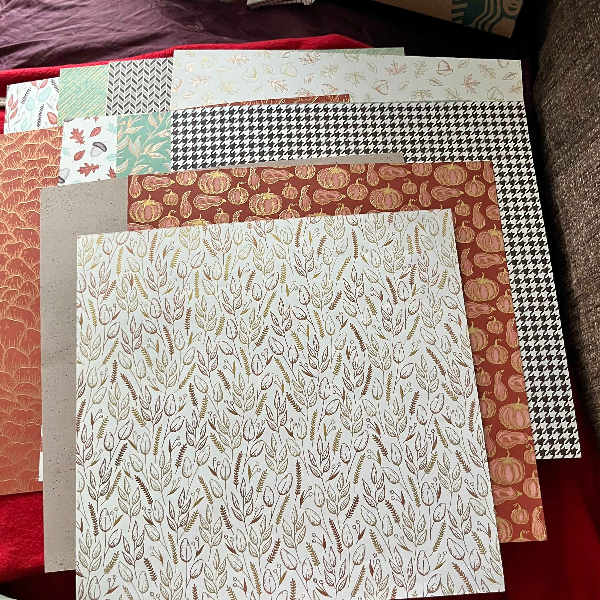 This pack of paper contains 10 full sheets of 12"x12" Specialty Designer Series Paper plus one sheet with approx 1/2"x12" strip missing. The colours used are Cajun Craze, Crumb Cake, Early Espresso, Mint Macaron, Very Vanilla with Gold and Copper gilding.