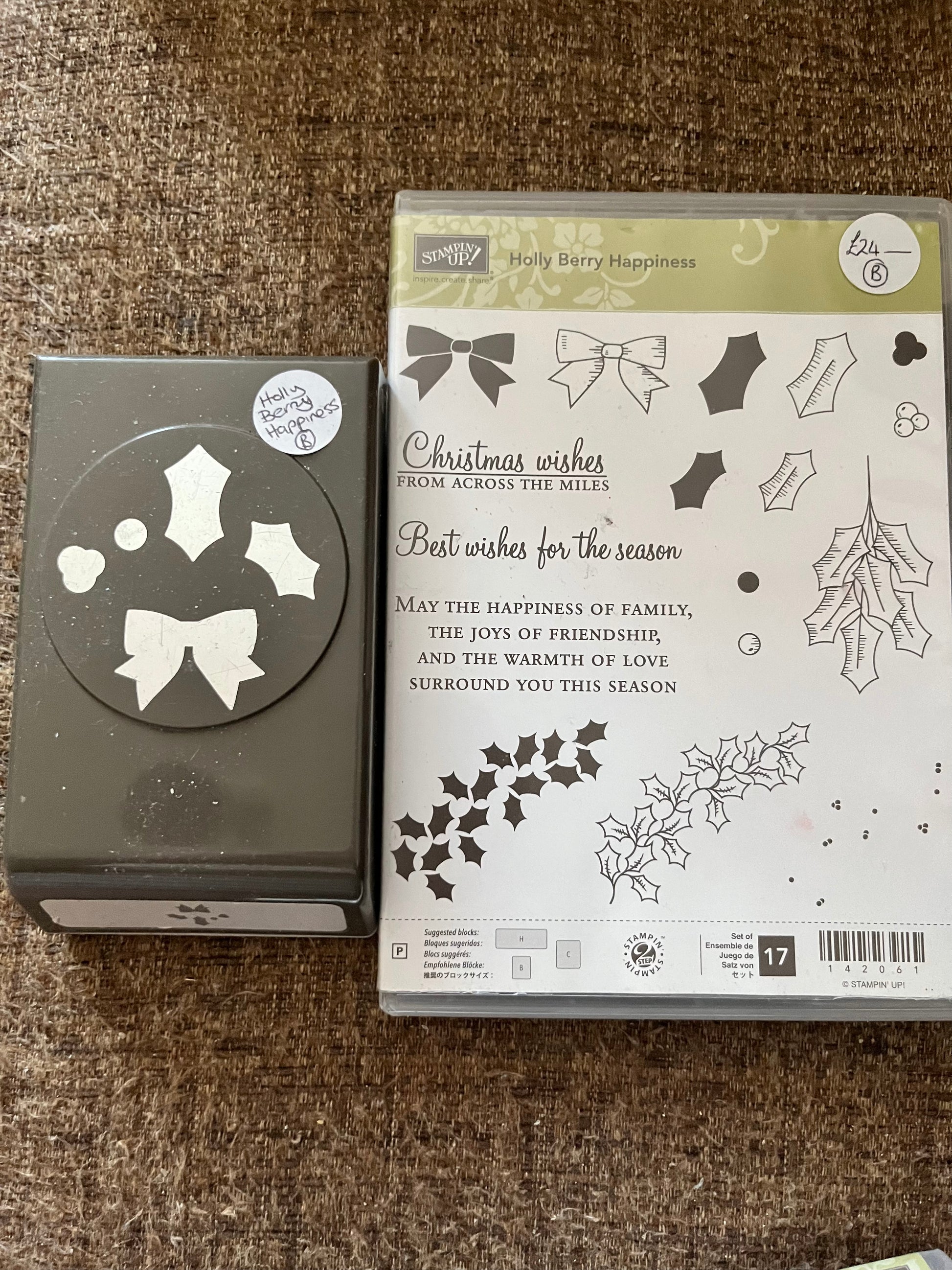 A Bundle containing a set of 17 stamps and a Builder Punch - the stamp set comprises of 14 picture stamps and 3 sentiments. The picture stamps are two step and the punch will cut out the holly, bow and berries.