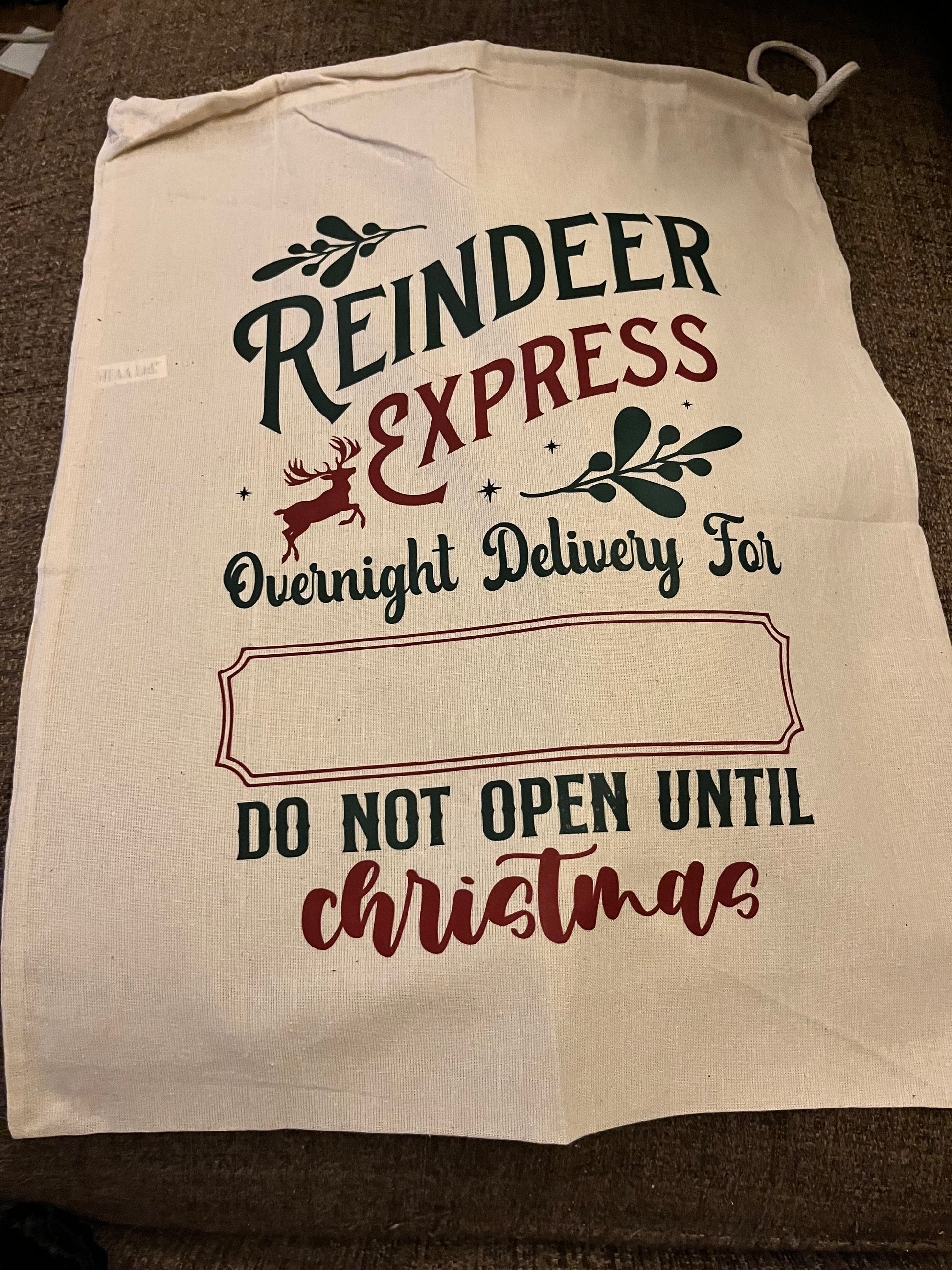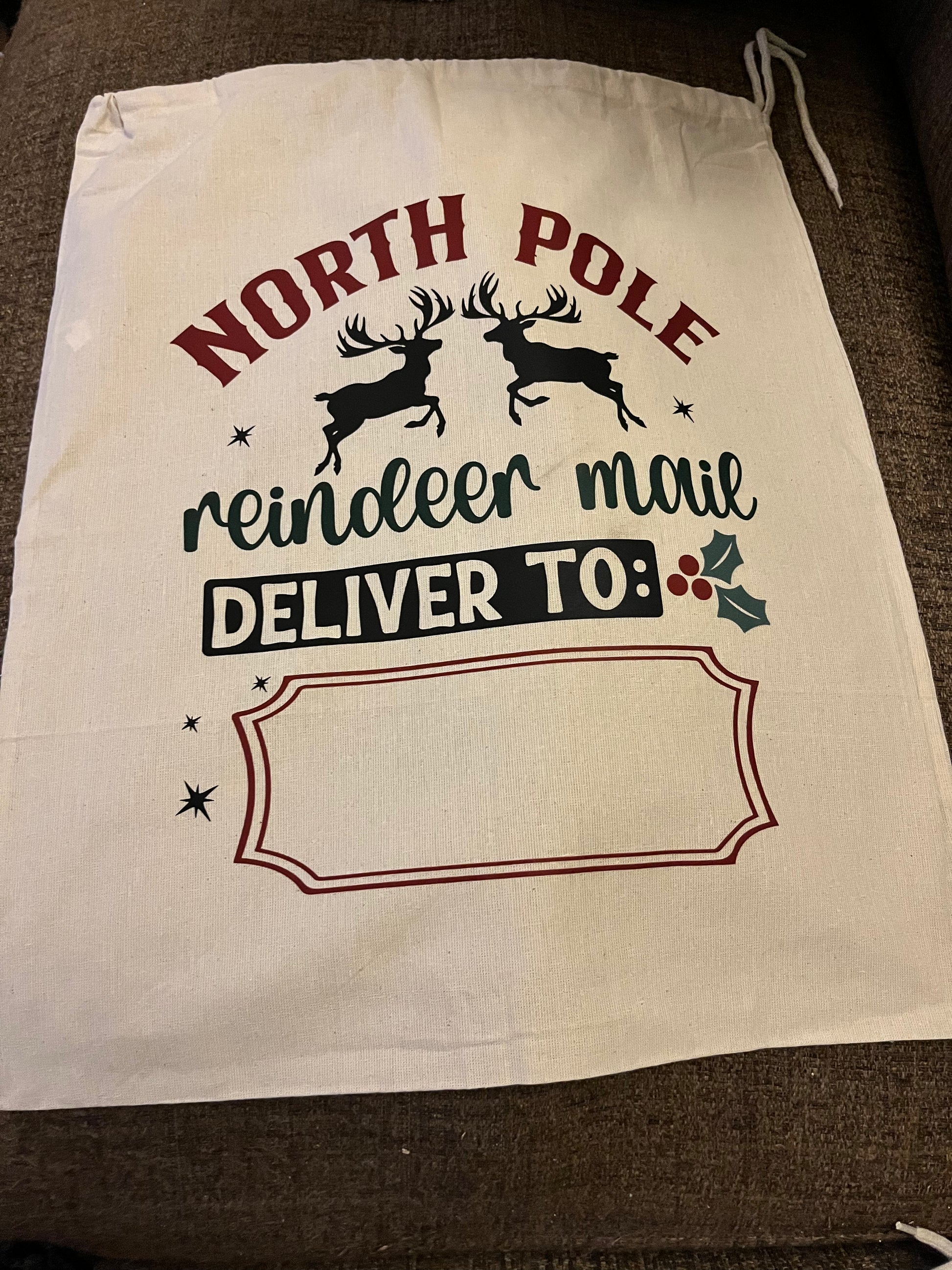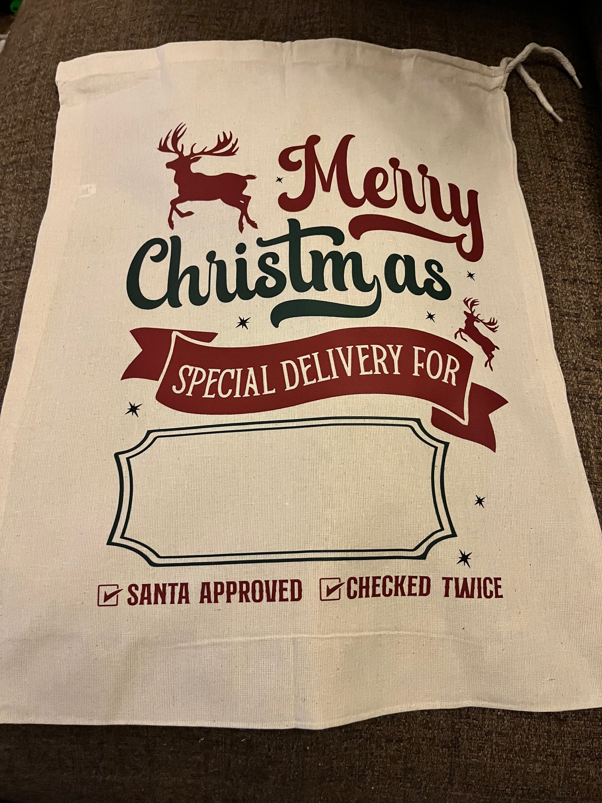 These 100% cotton Drawstring Santa Sacks measure approx 40cm x 50cm and can be personalised with your child's name.