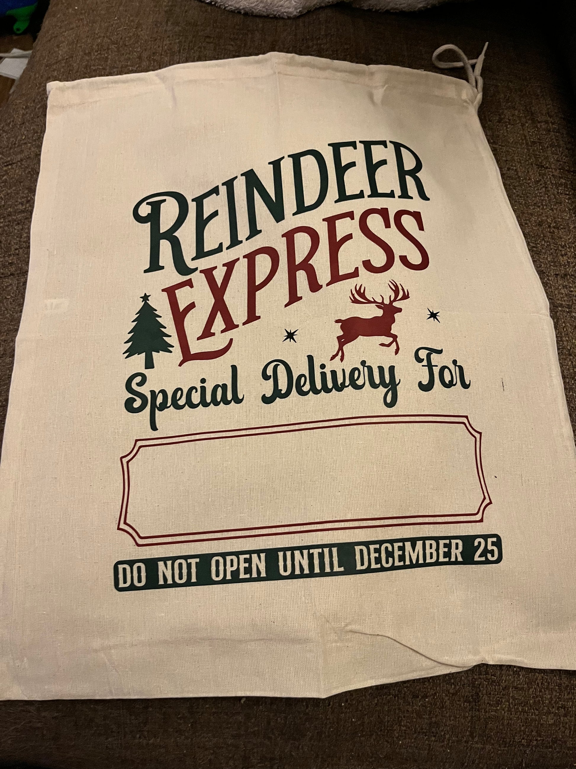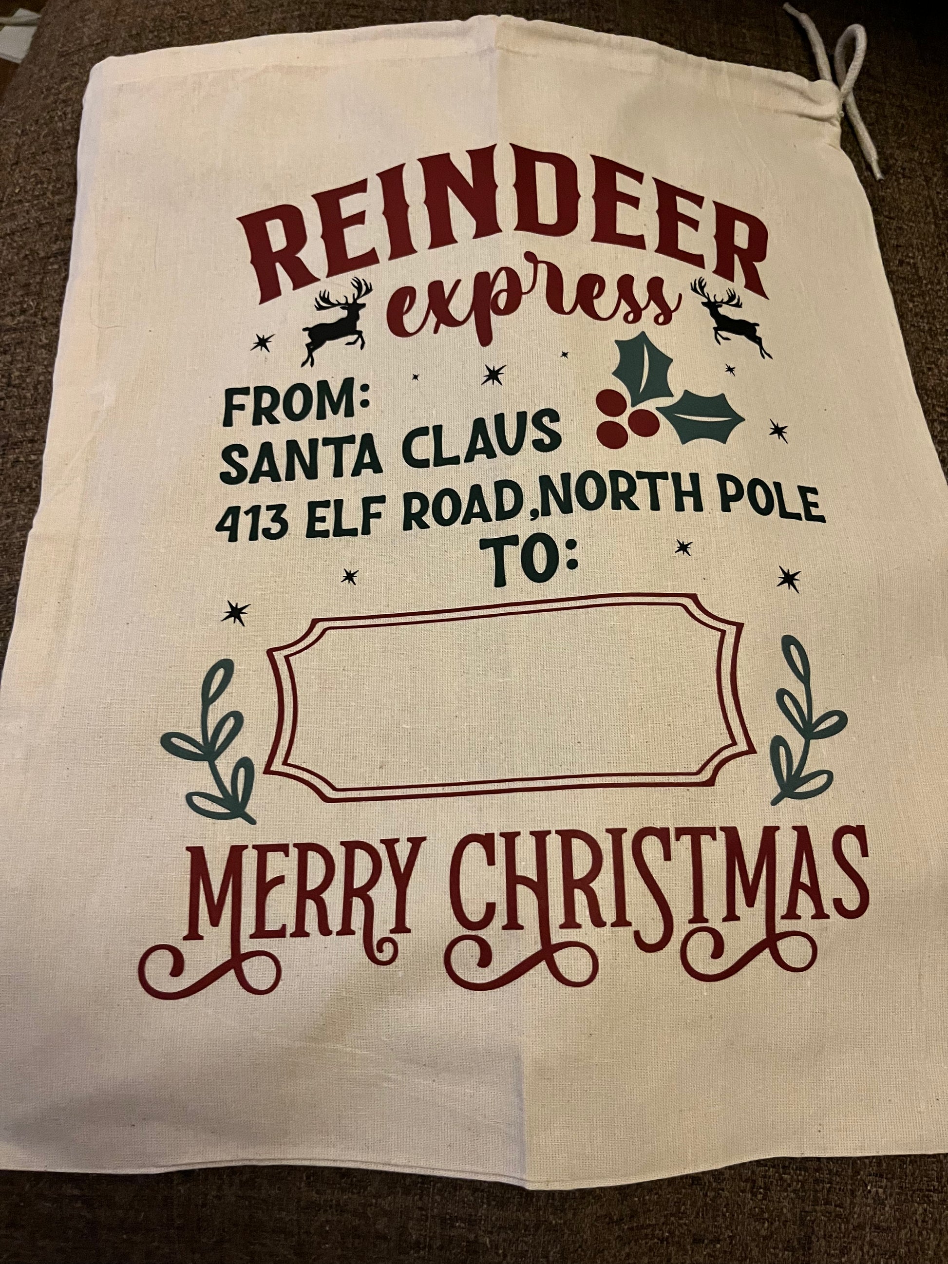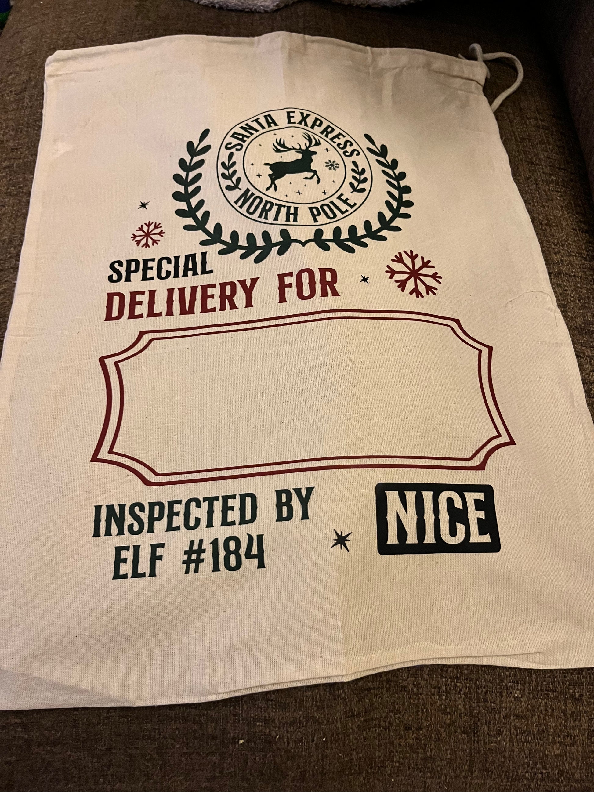 These 100% cotton Drawstring Santa Sacks measure approx 40cm x 50cm and can be personalised with your child's name.