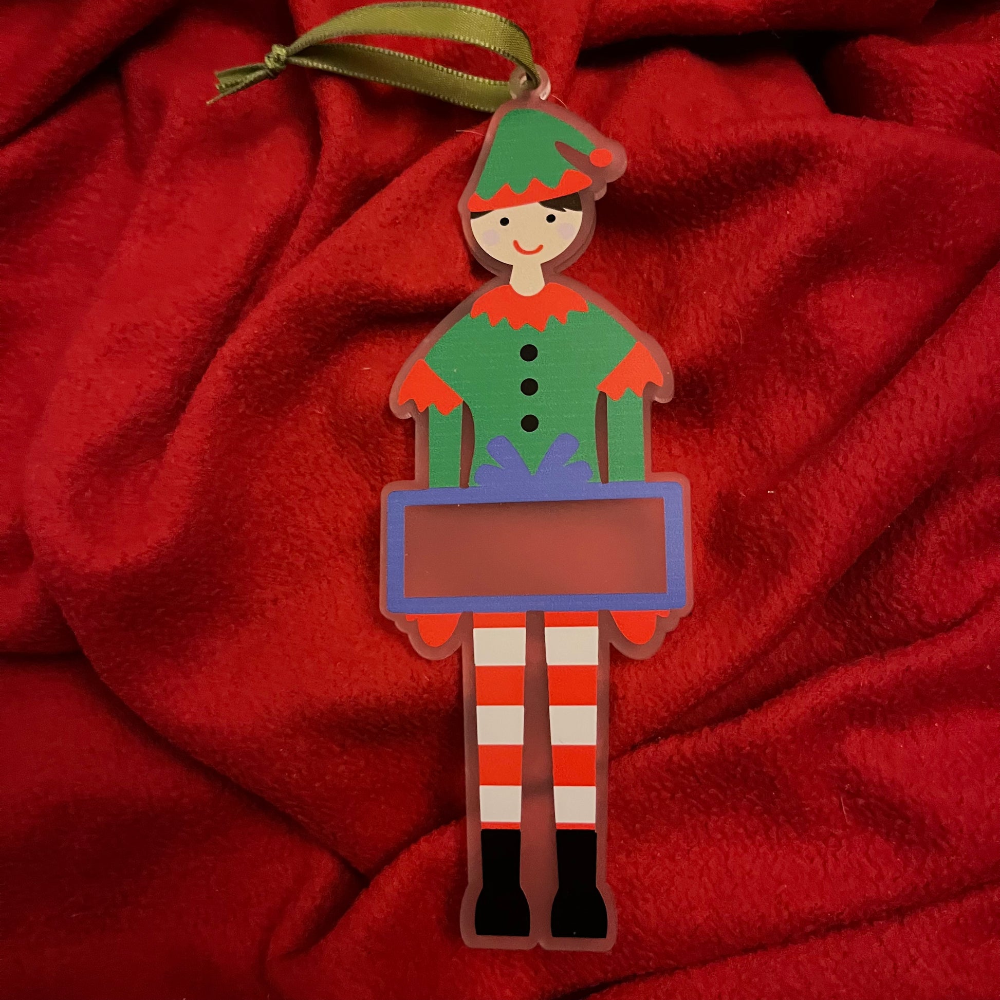 These fab Elf Decorations can be personalised in the box with your child's name and will make a great addition to your Christmas Tree. The vinyl is applied to frosted clear acrylic measuring approx 16cm x 6cm x 3mm.