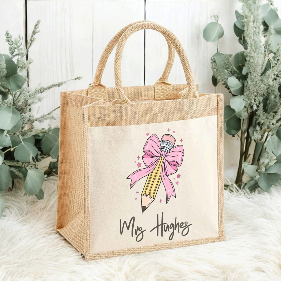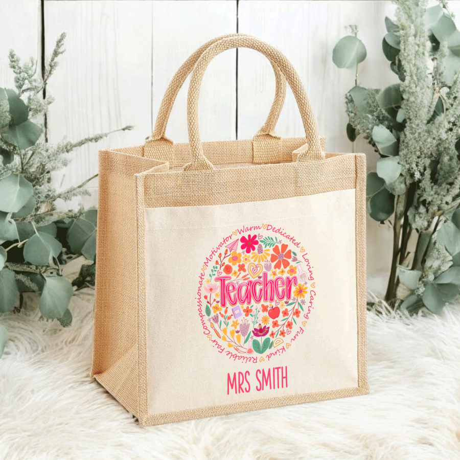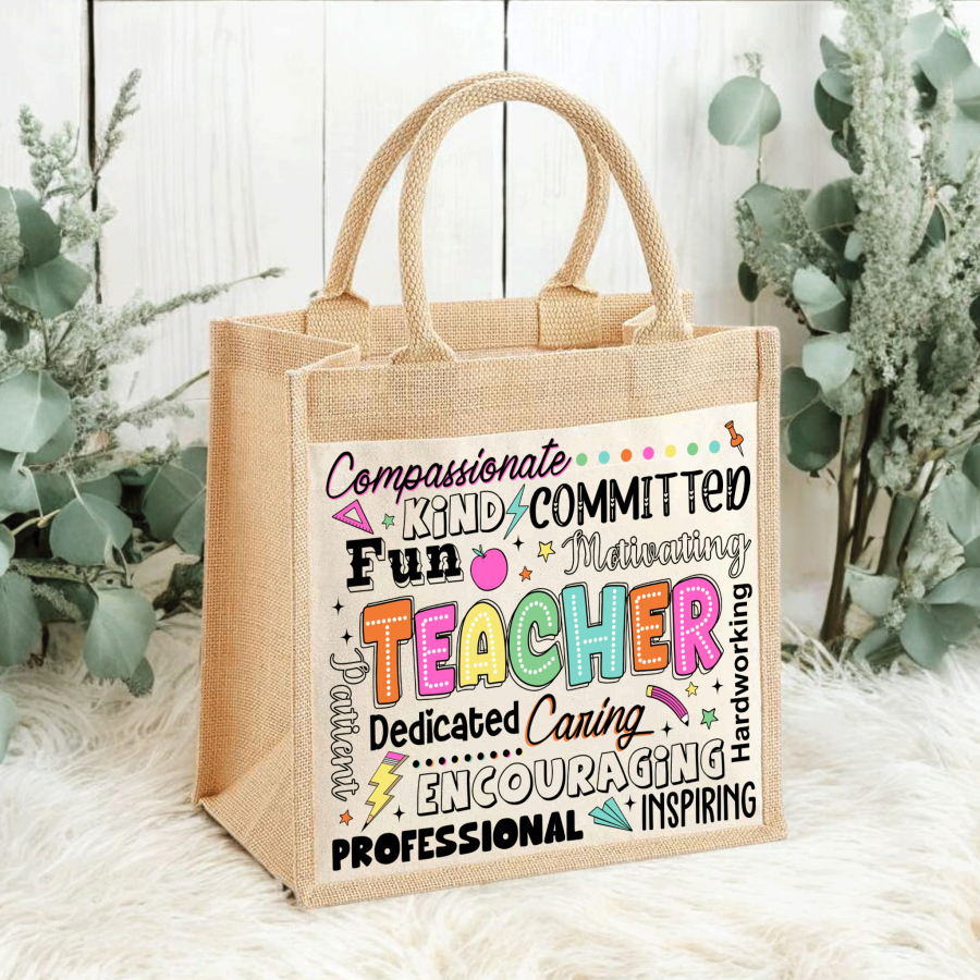 These Tote Bags are made from Laminated Jute with a Cotton Canvas front pocket and feature a selection of Teacher inspired designs and would make great gifts for any teacher. Bags measure 30x30x19cm