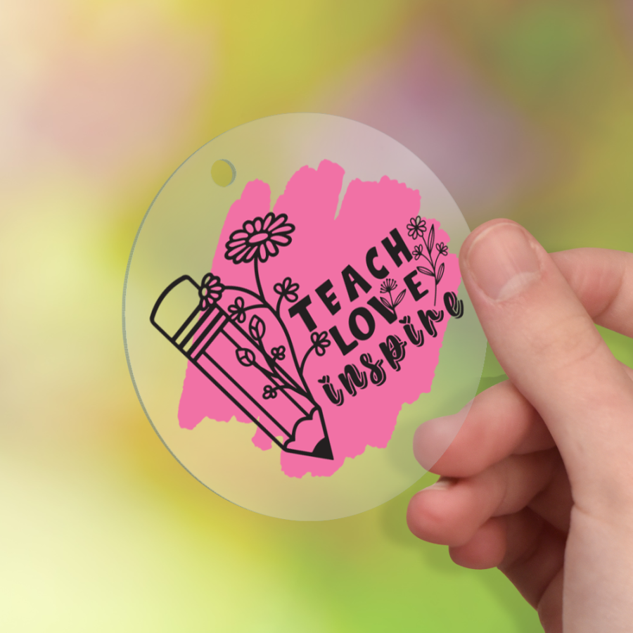 Each of these Keyrings features a Teacher inspired design on a 6cm circle shaped acrylic base with a short chain - available with or without a leather effect tassel. You have a choice of three acrylic bases - clear; frosted; & clear with silver stars & glitter.