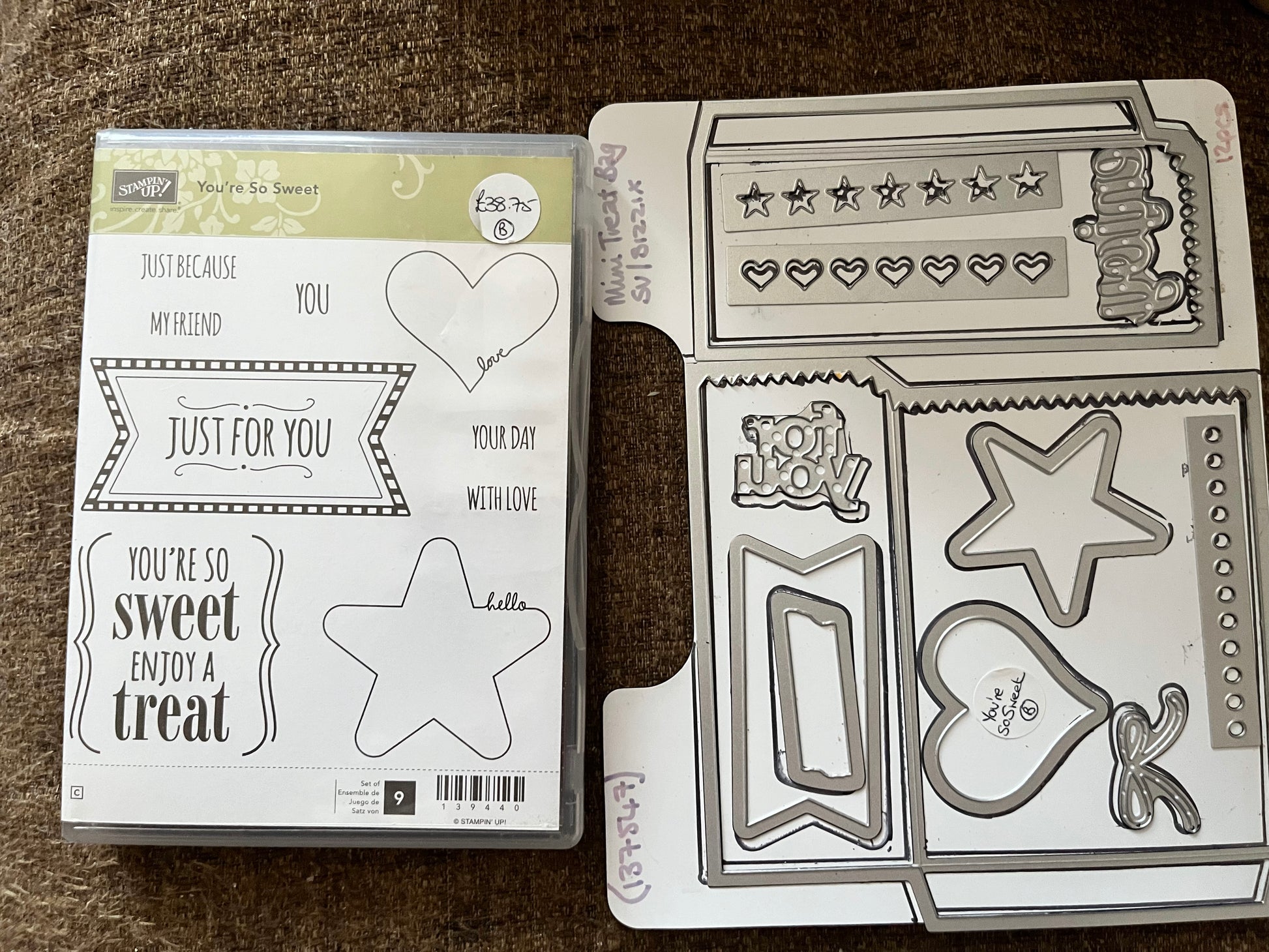 A Bundle containing a set of 9 word/sentiment stamps and 12 dies - the dies are framelits and cut out a 2 piece treat bag, the heart and star images, enjoy & for you words as well as a selection of decorations for your bag.