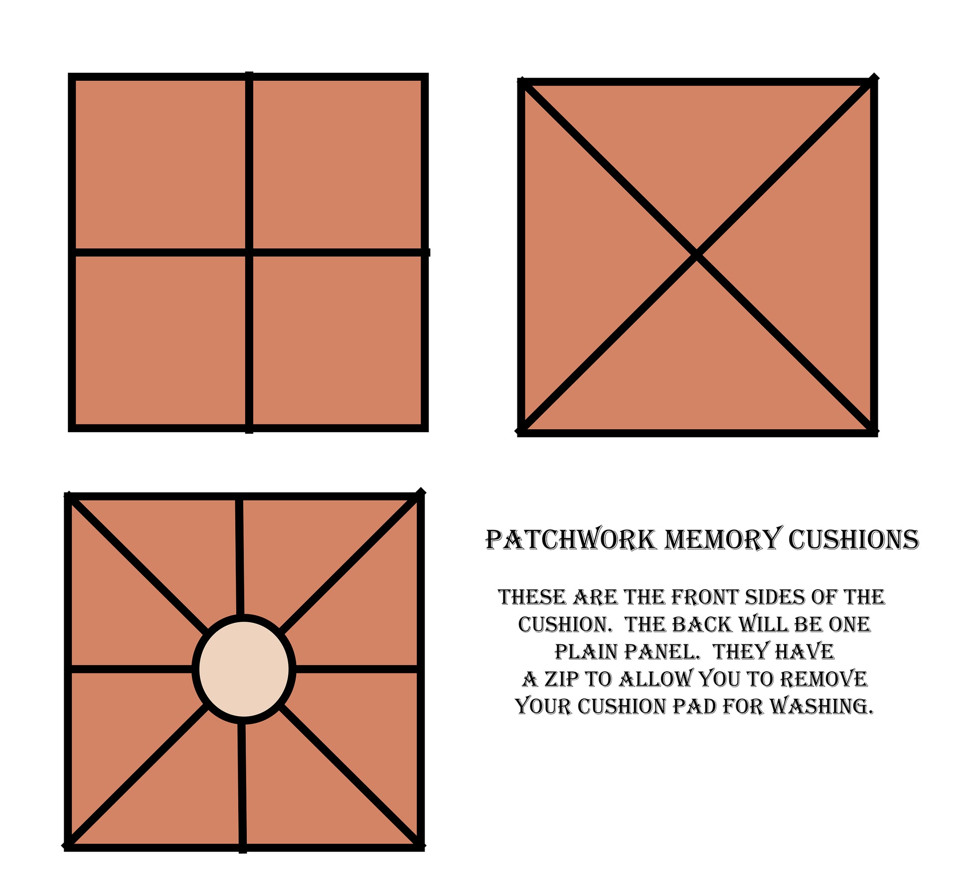 Our cushion covers can be made from the clothes of a loved one no longer here, or clothing from a special occasion. The Zipped Patchwork Cushion Cover can be made from up to 5 items of clothing - where possible I will use any decorative elements. The front face of the cover will be patchwork and the back face one single fabric. I currently create three different designs - four square, four triangle and complex.